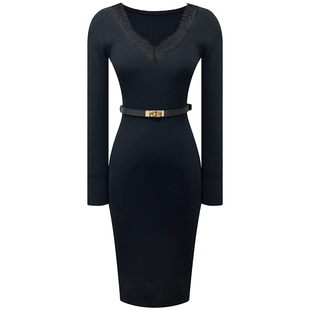 内搭包臀裙 女人味V领针织修身 性感蕾丝拼接黑色连衣裙女秋季 新款