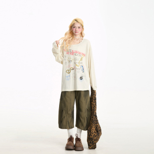 辣妹宽松街头透气小众上衣 美式 NERESUM卡通涂鸦斜肩长袖 T恤女夏季
