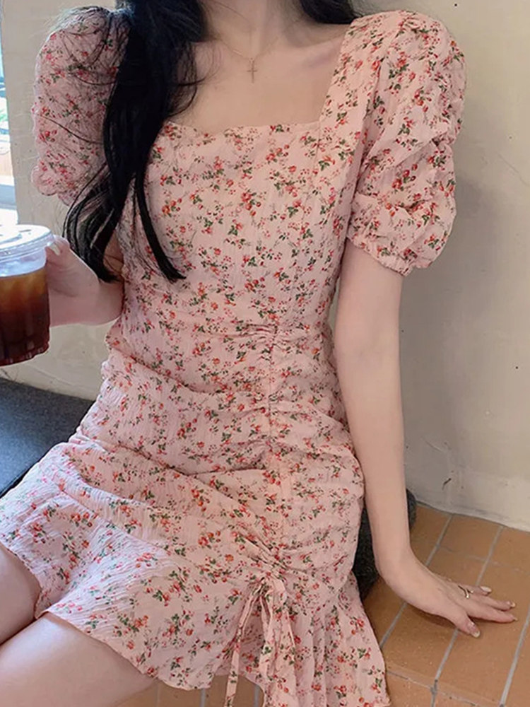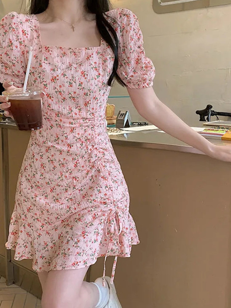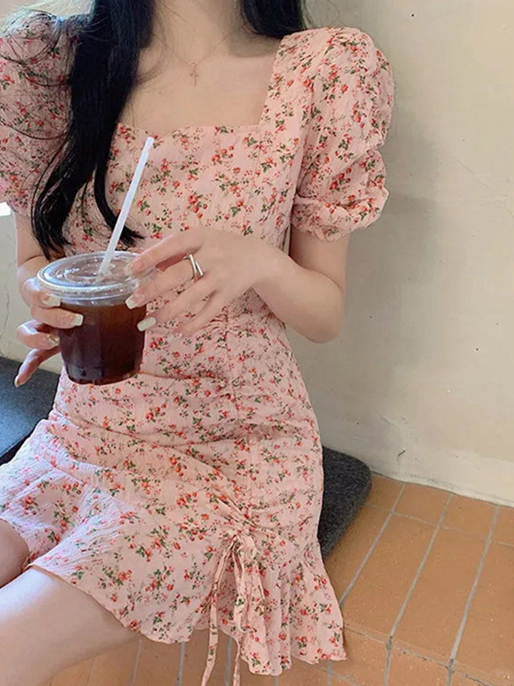 甜辣粉色碎花方领连衣裙女夏季 小众设计感收腰显瘦气质短裙子 新款