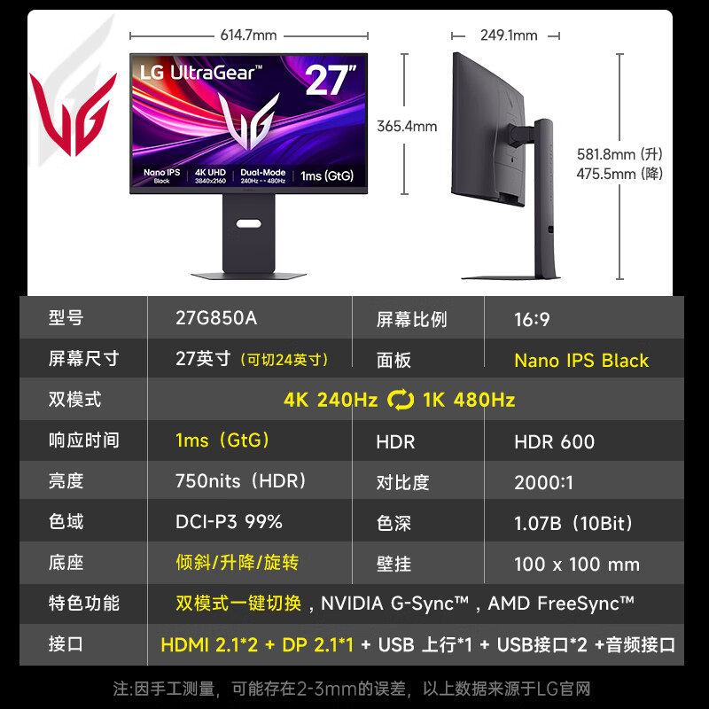 IPS六代电竞屏 27G850A双模显示器4K240HZ切换1K480HZ高刷Nano