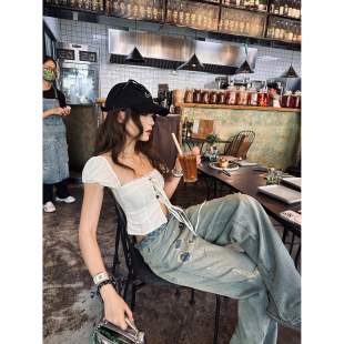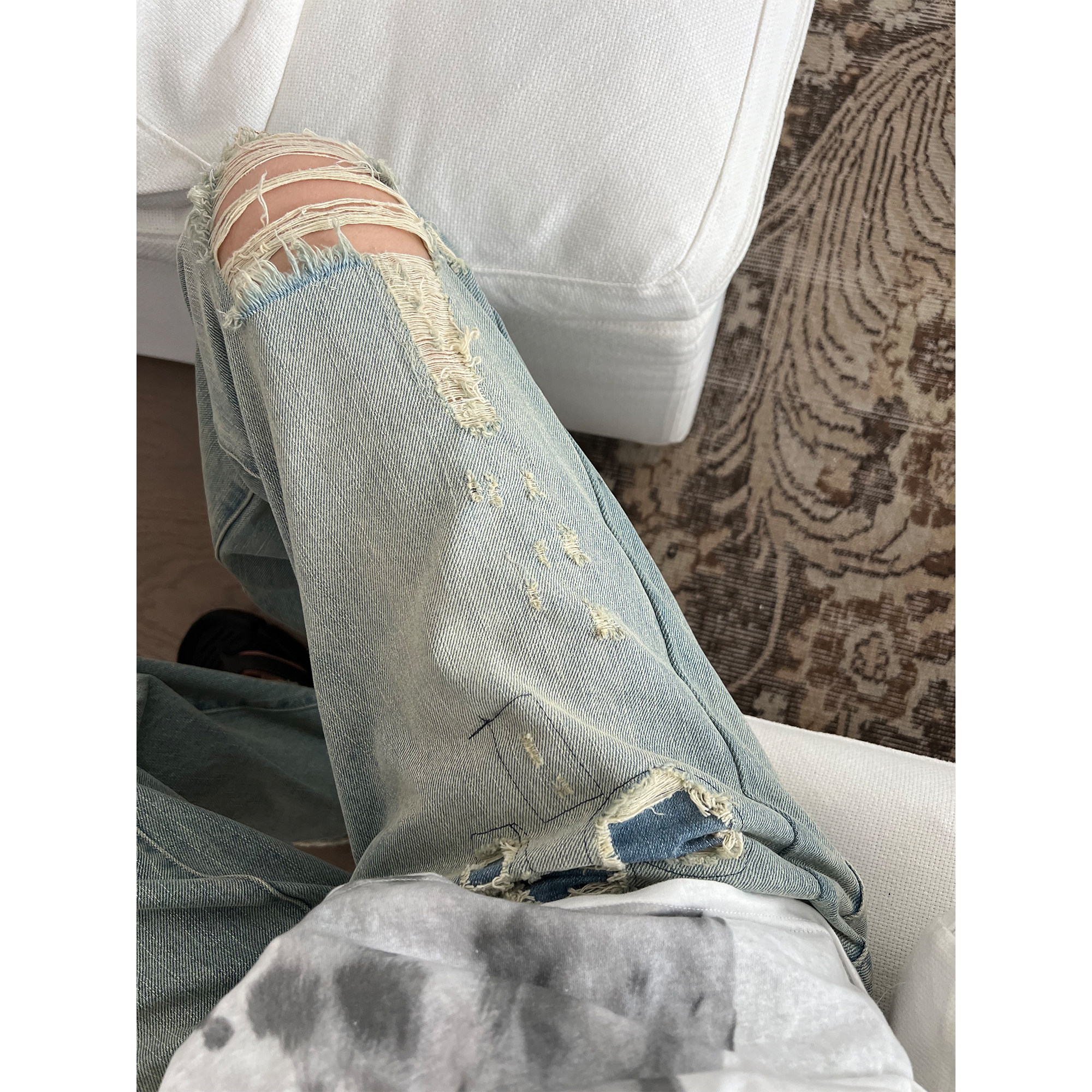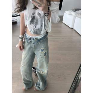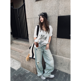 女直筒裤 Xinlei 私物古着贴布浅色破洞牛仔裤 辣妹blue Lin