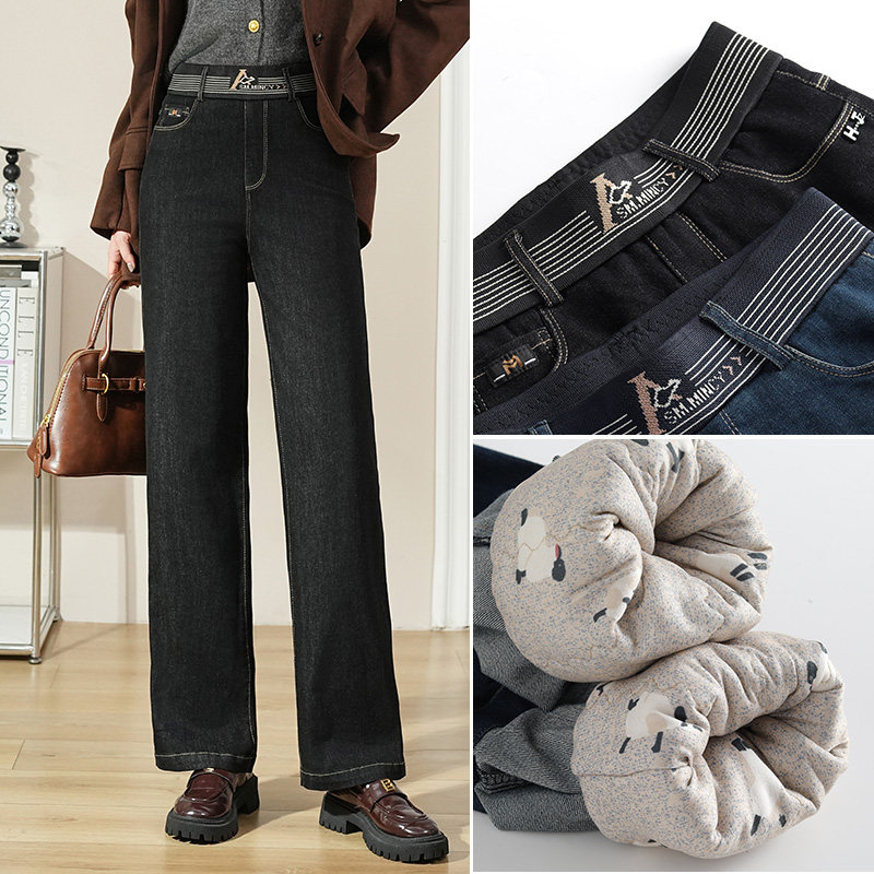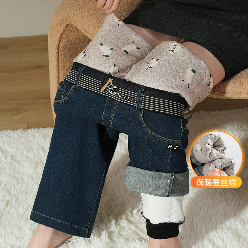 新款 冬季 一体蚕丝棉直筒裤 女高腰显瘦窄版 时尚 阔腿裤 保暖牛仔棉裤