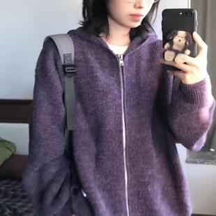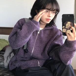宽松针织衫 oversize 韩版 女春装 拉链外套 慵懒风紫色连帽毛衣开衫