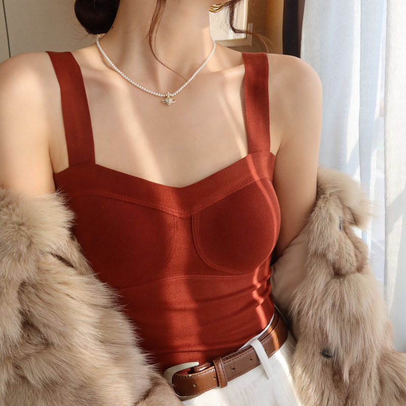 法式 米白V领蕾丝吊带背心女秋冬磨毛一体带胸垫保暖内衣打底上衣