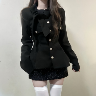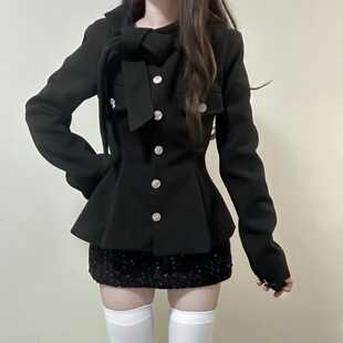 iqcq气球熊法式 气质黑色小香风绑带蝴蝶结收腰毛呢外套亮片包臀裙