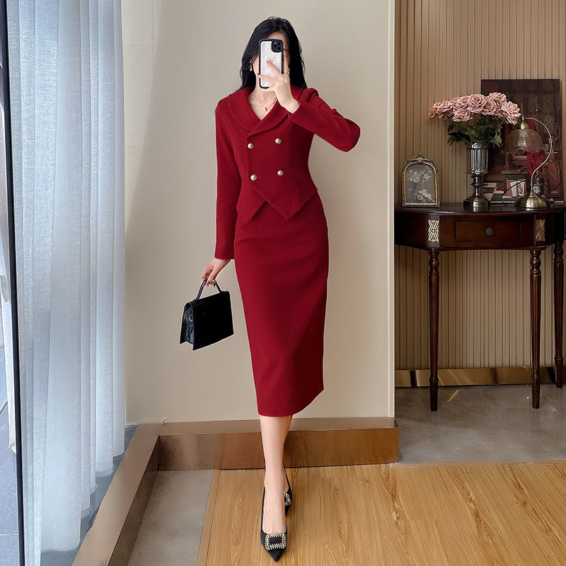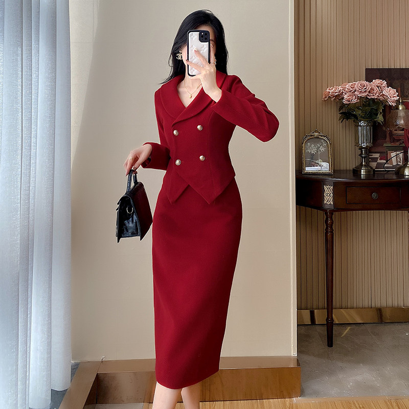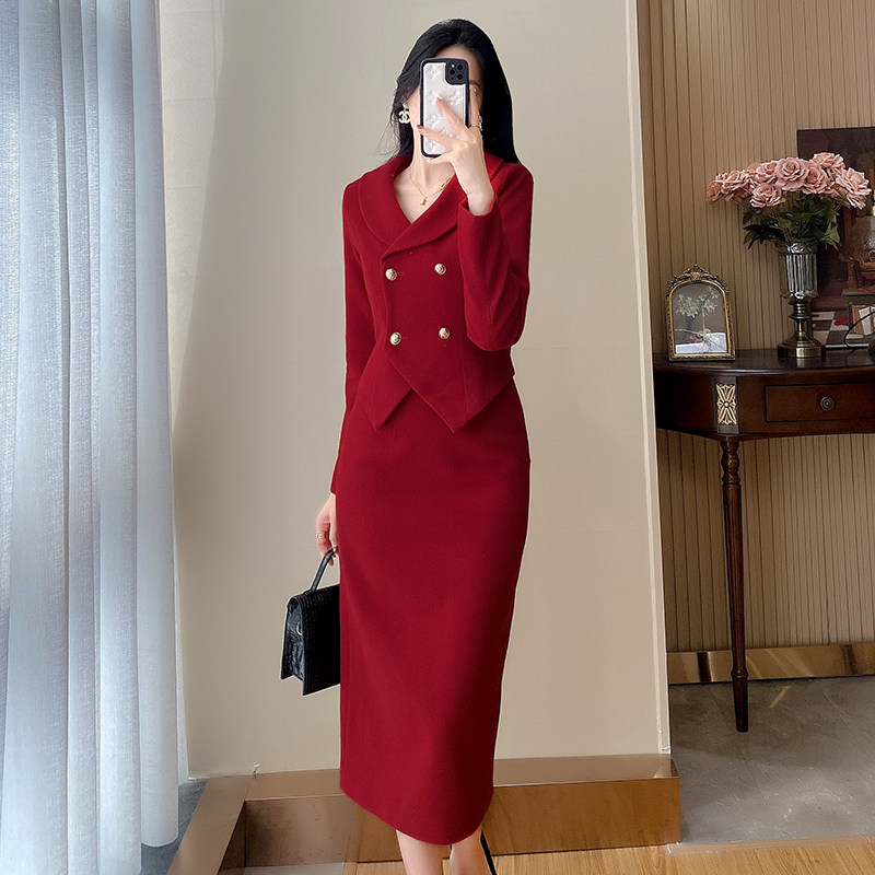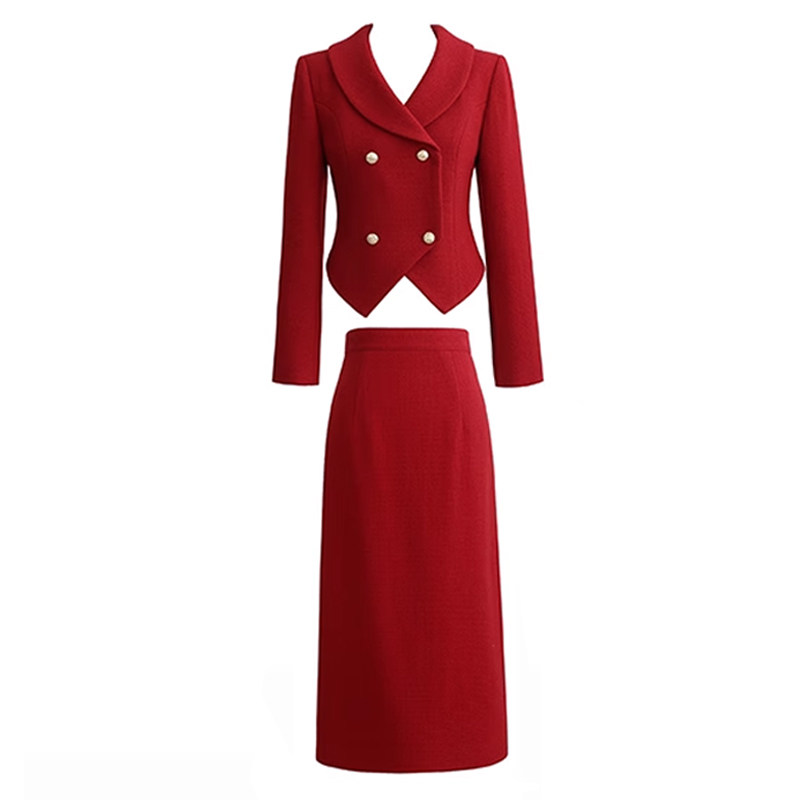 小香风红色两件套套装 今年流行秋冬粗花呢高端气质新年战袍女套裙