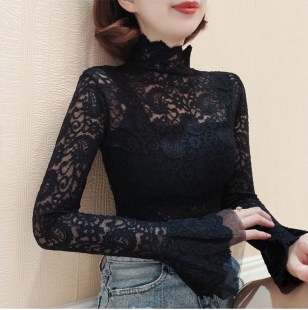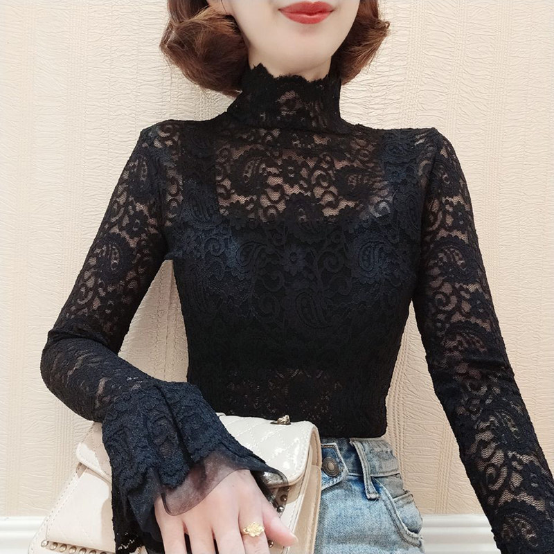 镂空小衫 女春秋洋气法式 秋冬内搭网纱上衣 半高领蕾丝打底衫 喇叭袖