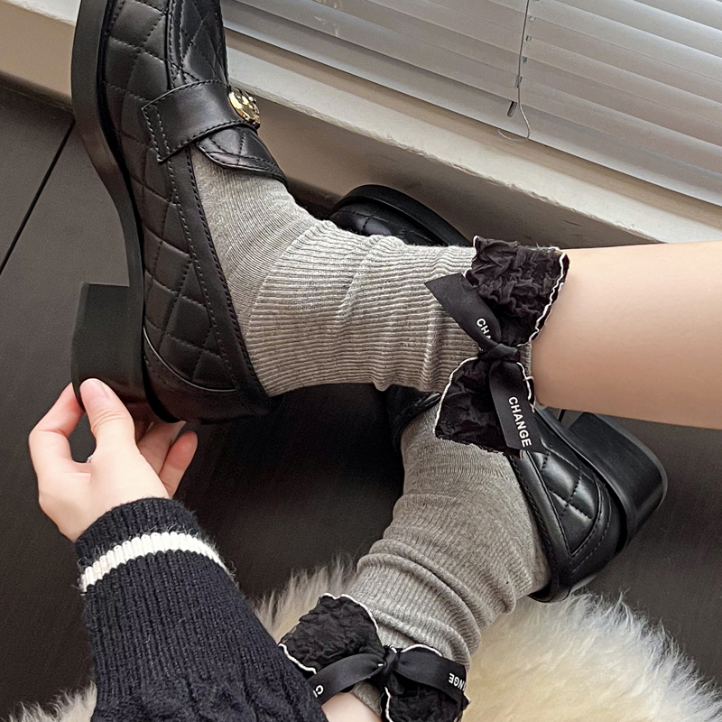 小香风蝴蝶结白色短袜子秋冬棉竖纹咖啡色中筒堆堆袜灰色小腿袜女