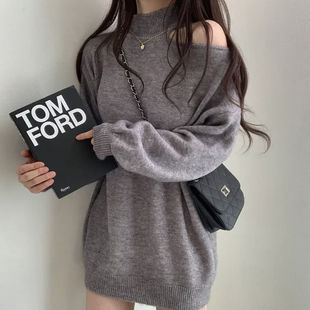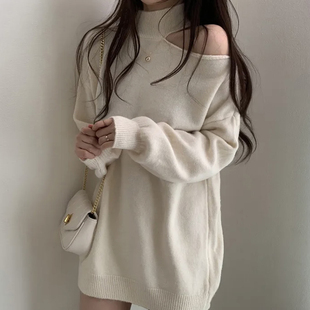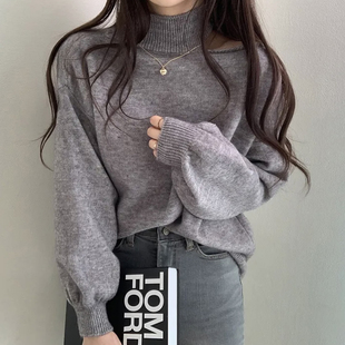 韩国chic秋冬小众气质高领镂空露肩设计宽松休闲百搭长袖 针织毛衣