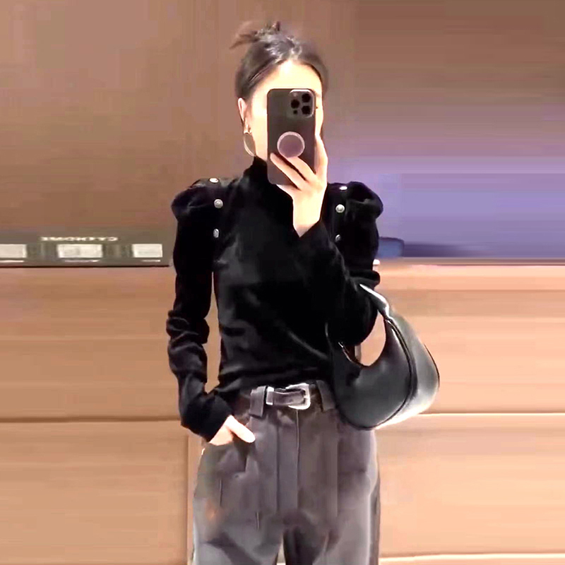 T恤打底衫 丝绒上衣女显瘦半高领长袖 洋气泡泡袖 欧洲站2024秋新款