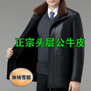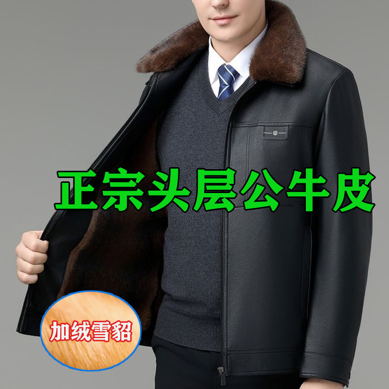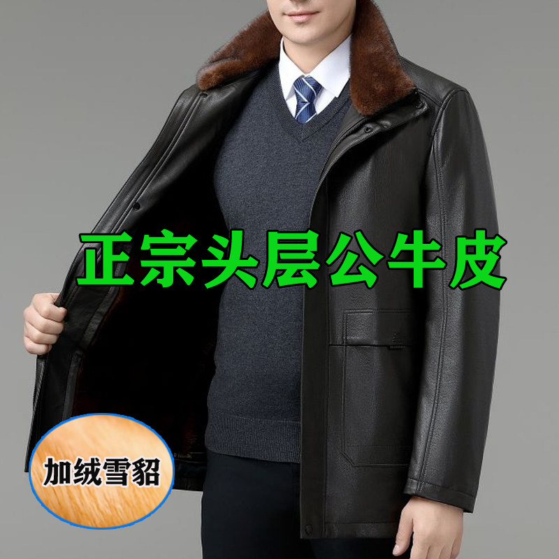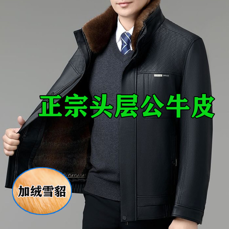 皮毛一体男士 外套 头层牛皮夹克羊羔毛翻领真皮皮衣加绒加厚爸爸装