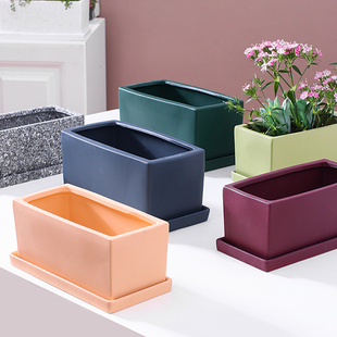 陶瓷长方形花盆带托盘北欧简约多肉绿萝办公室桌面有孔小号盆栽器