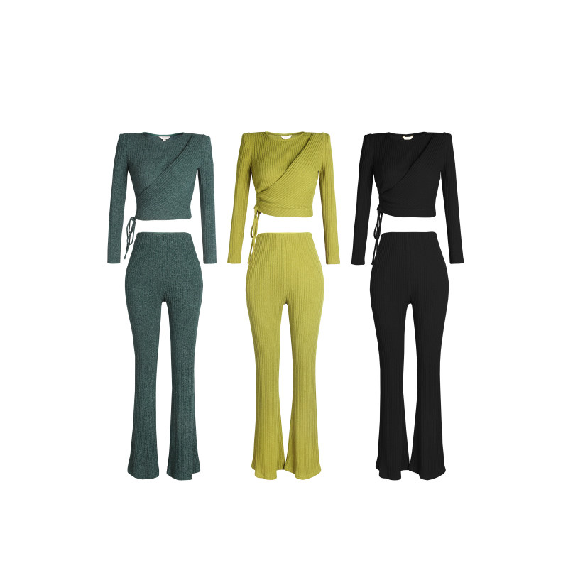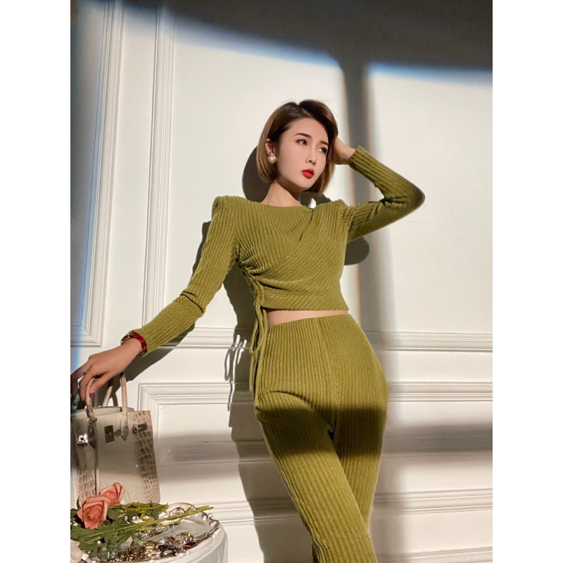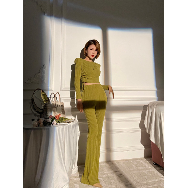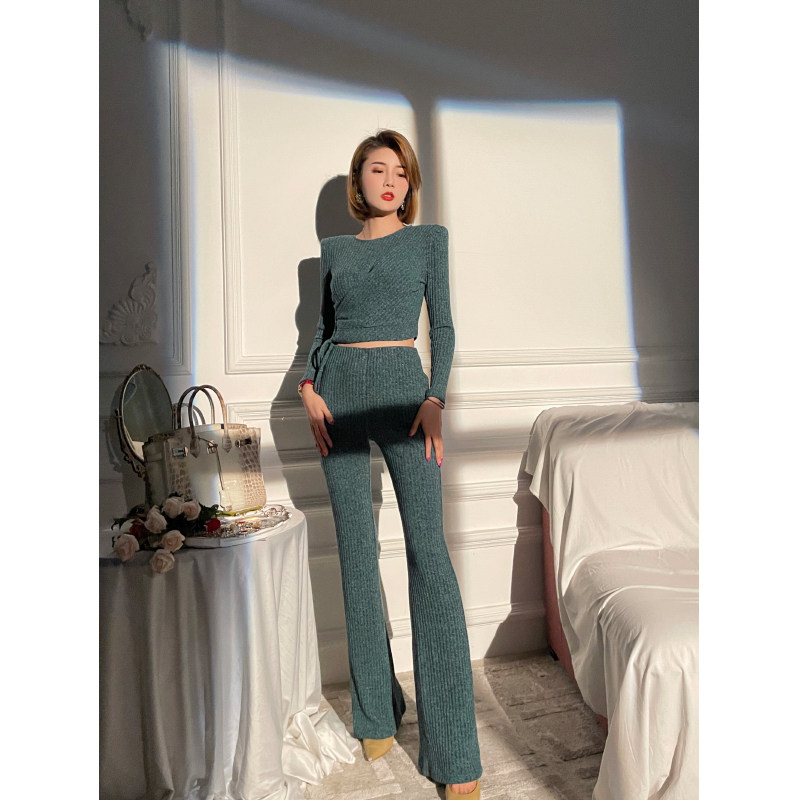XULU原创气质针织高腰休闲喇叭裤 上衣 性感气质抽绳设计短款