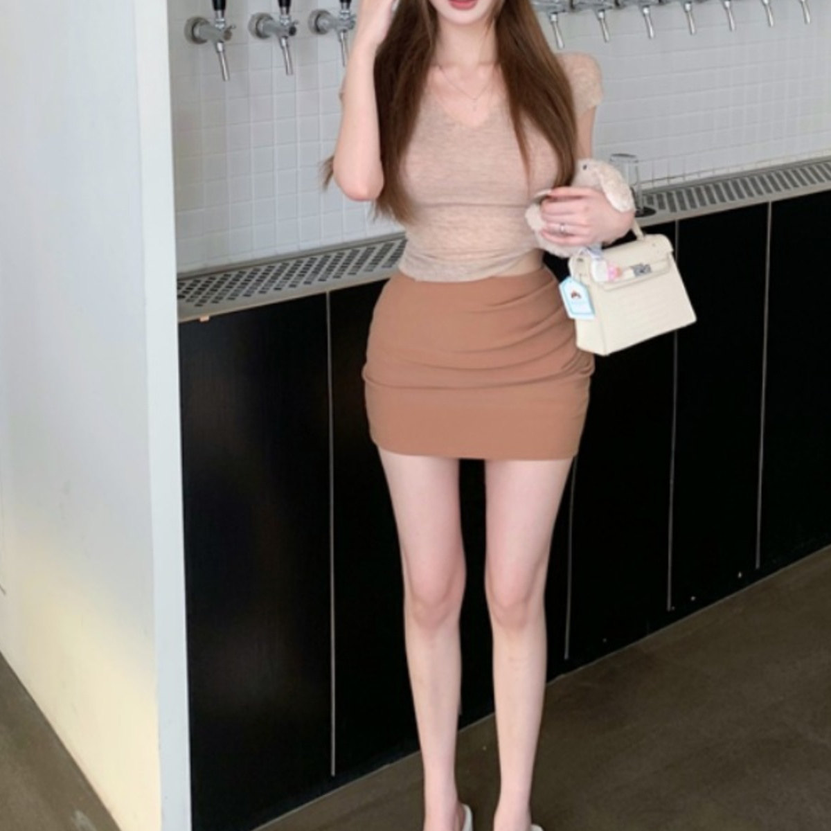 T恤上衣女夏季 短袖 高腰包臀半身裙两件套 纯欲性感辣妹V领修身 法式