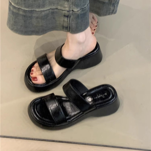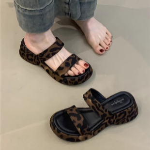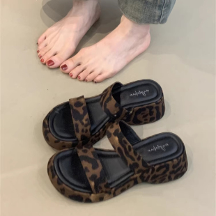 增高沙滩拖鞋 一字带凉鞋 女夏外穿2026新款 小众厚底豹纹坡跟凉拖鞋