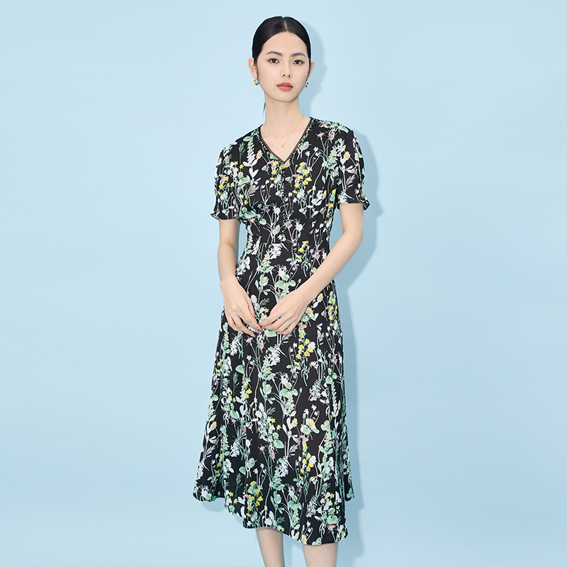女装 黑色印花连衣裙子钉珠V领收腰短袖 马天奴春夏新款 专柜正品
