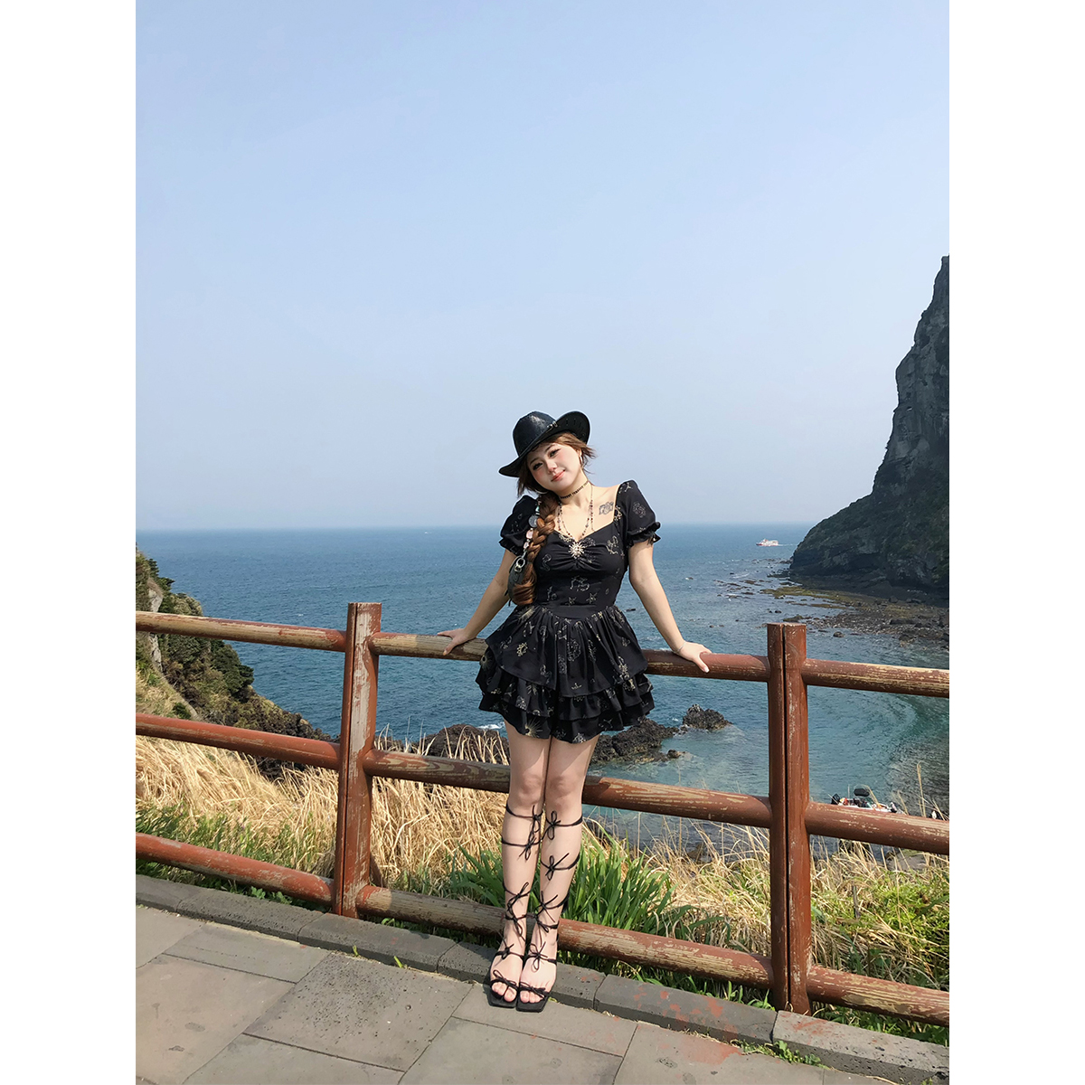 安妮不火 设计感小黑裙子 琥珀流浪诗星宿印花收腰连衣裙微胖大码