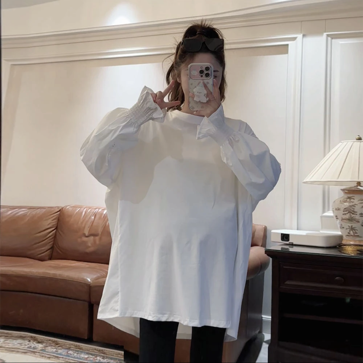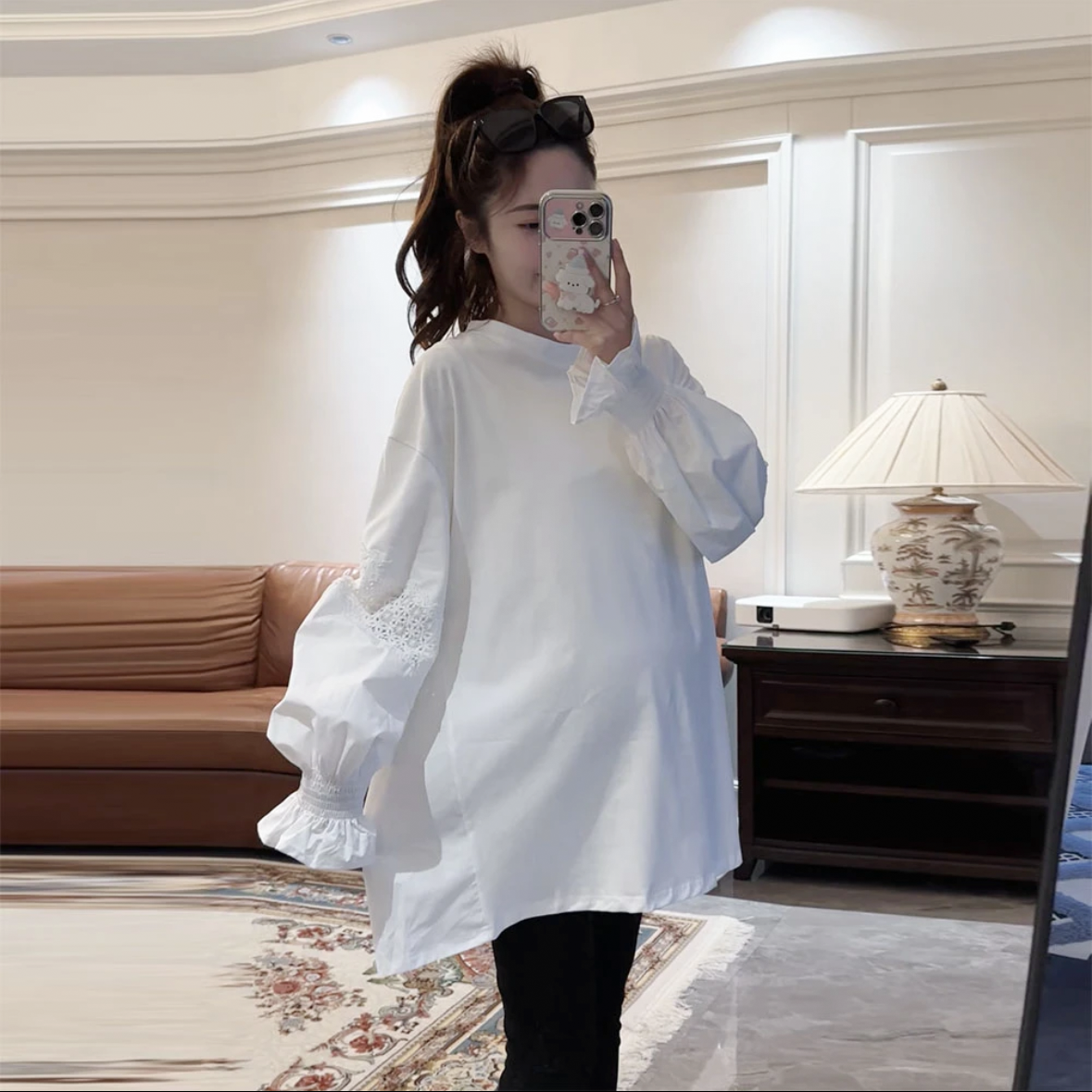 宽松上衣秋装 白色圆领拼接衬衣镂空打底衫 洋气T恤秋季 诺初孕妇装