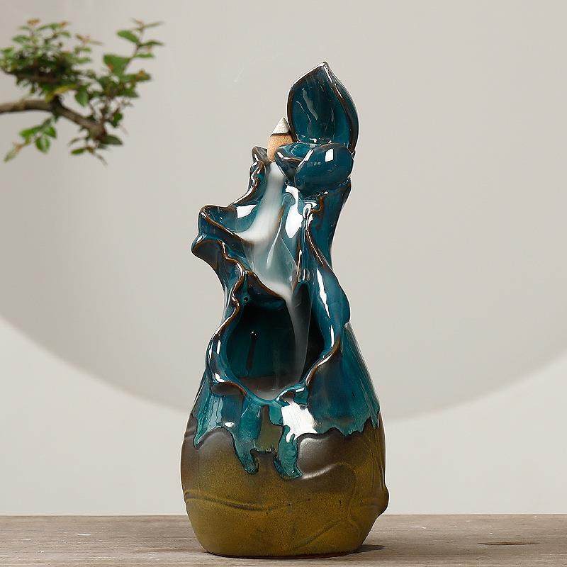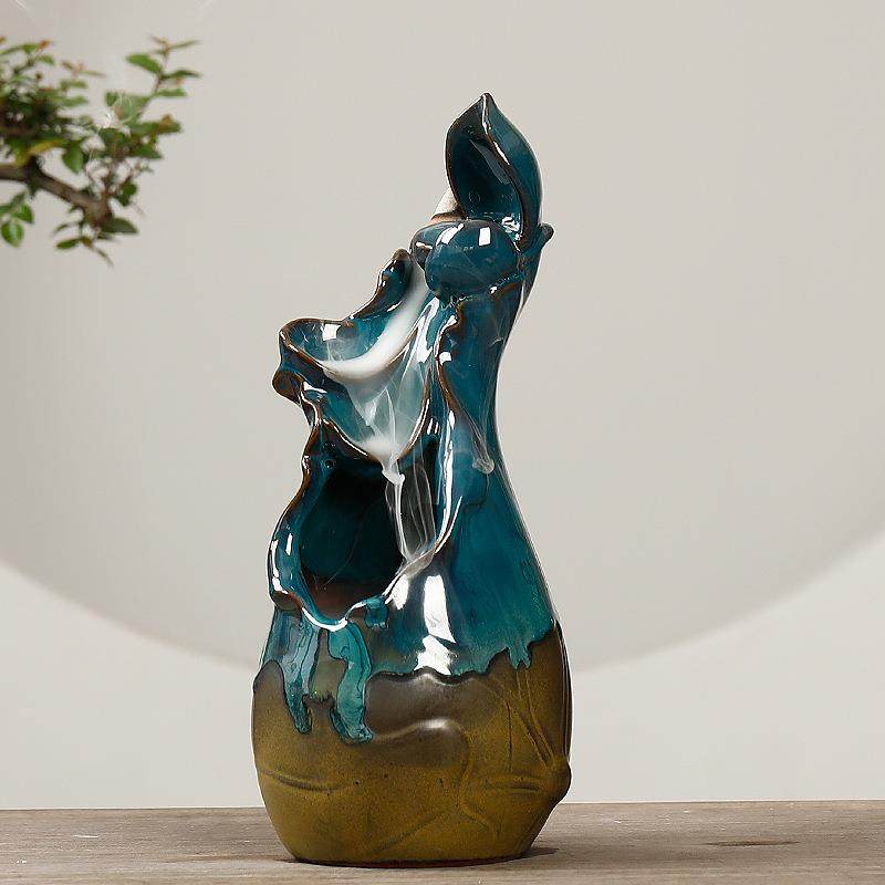 跨境 创意绿色荷花莲舞香道工艺品家居摆件 陶瓷观赏烟倒流香薰炉