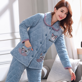 珊瑚绒睡衣女秋冬季 家居服冬天 加绒加厚保暖法兰绒三层夹棉袄新款