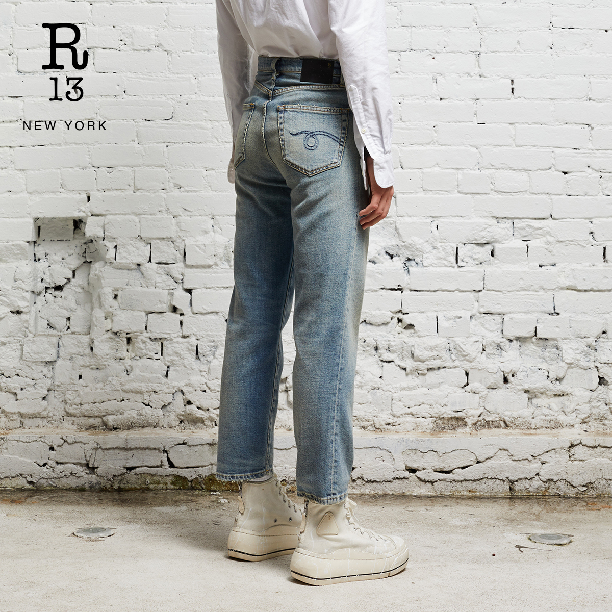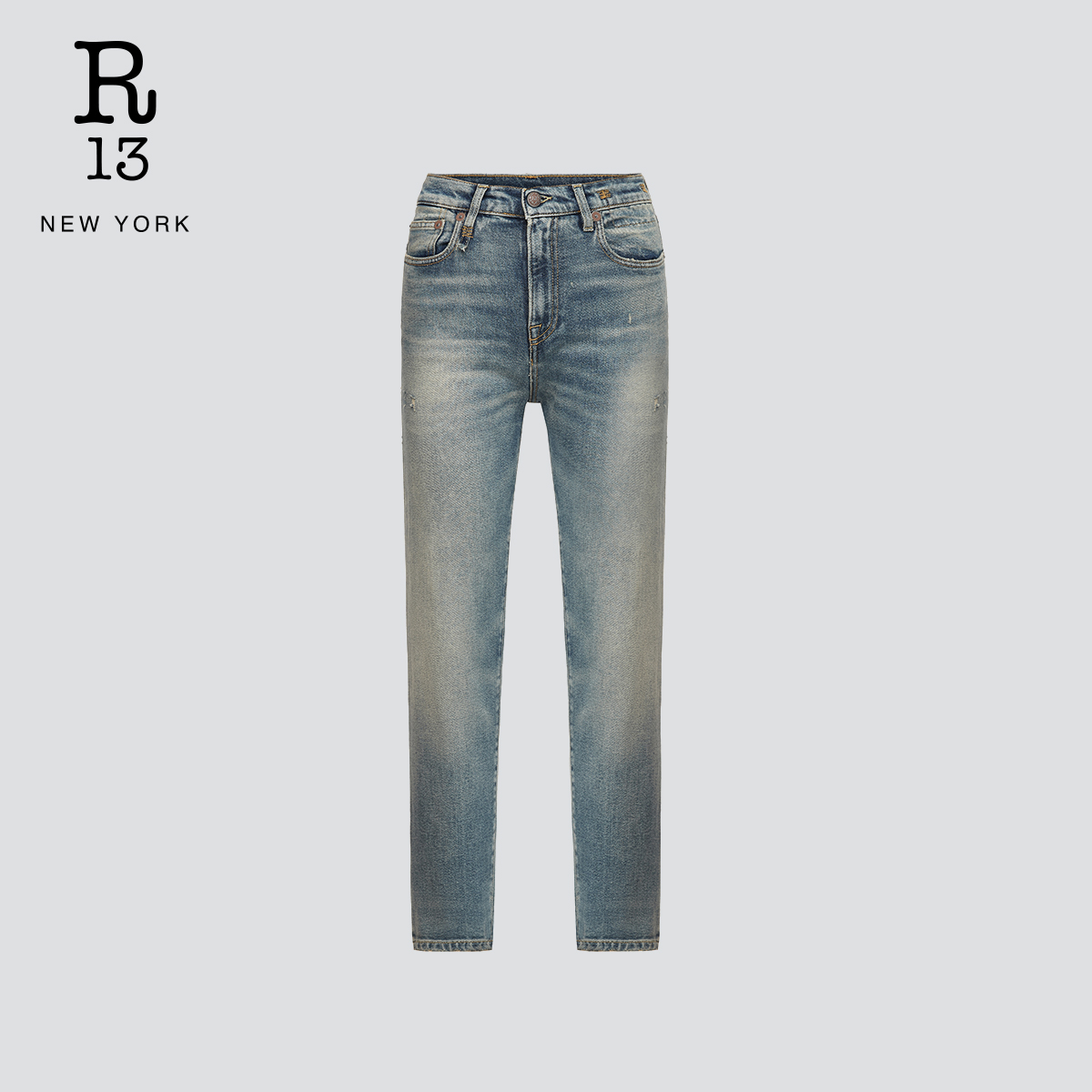 型复古设计蓝色牛仔裤 R13 版 弹力舒适高腰直筒修身 女 SHELLEY