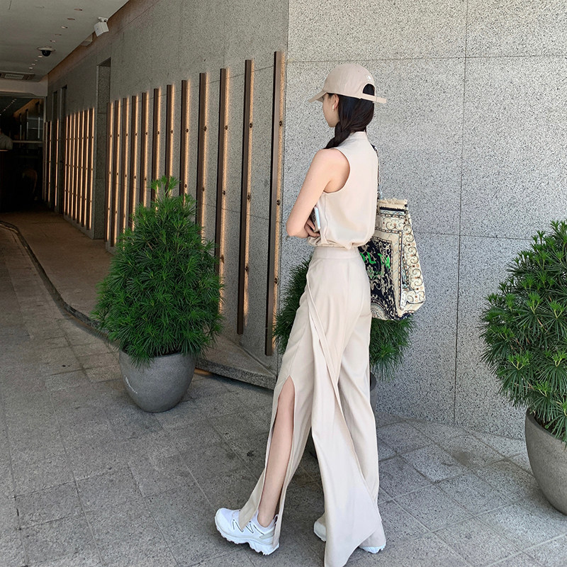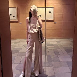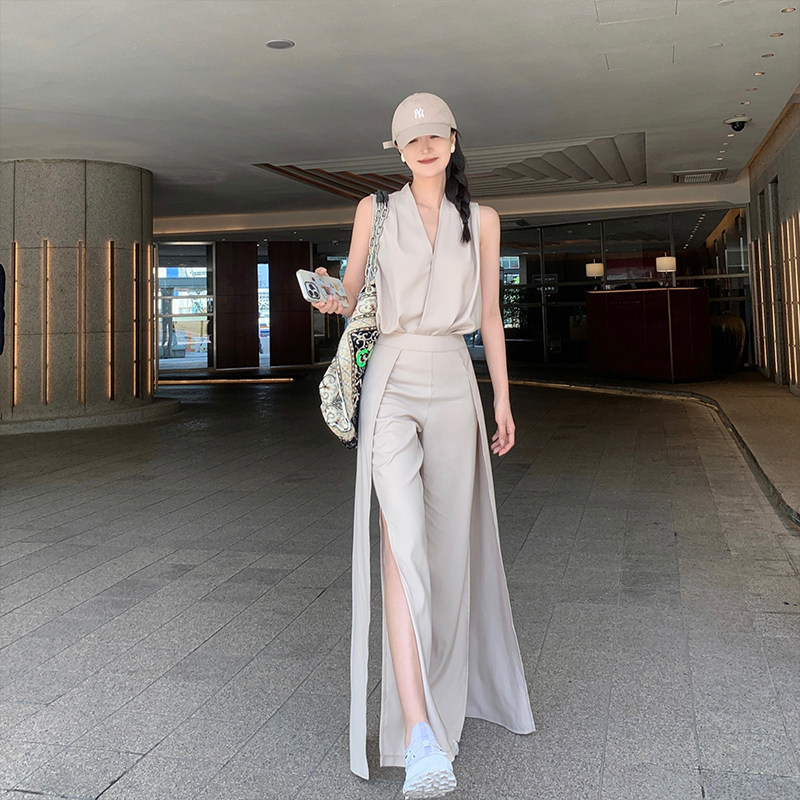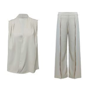 V领上衣阔腿裤 奶茶色无袖 套装 5折