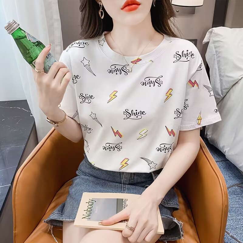 潮ins印花T恤女学生设计感圆领上衣 新款 欧货修身 显瘦百搭2025夏季