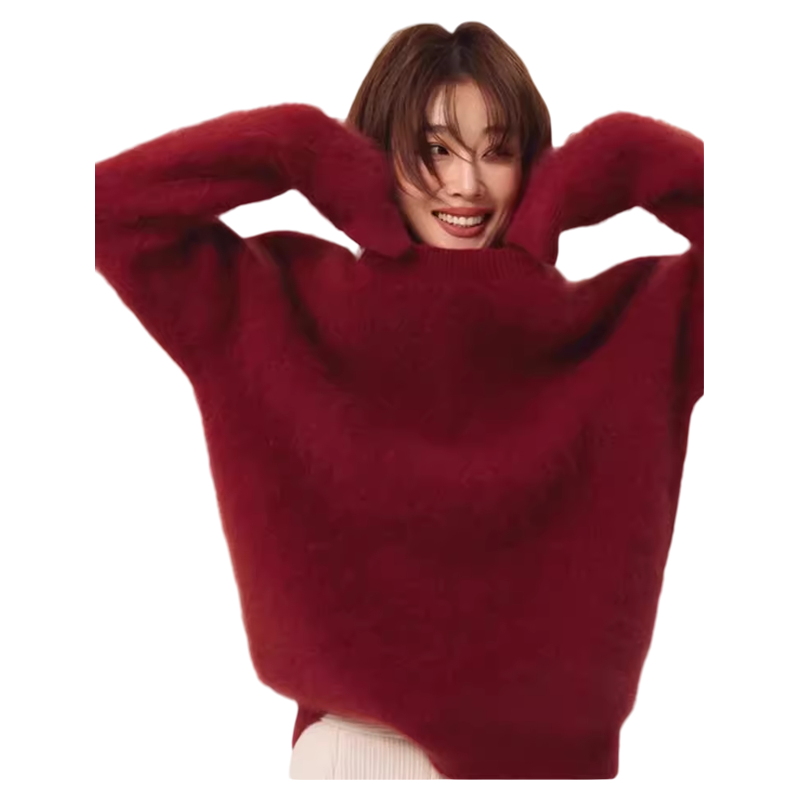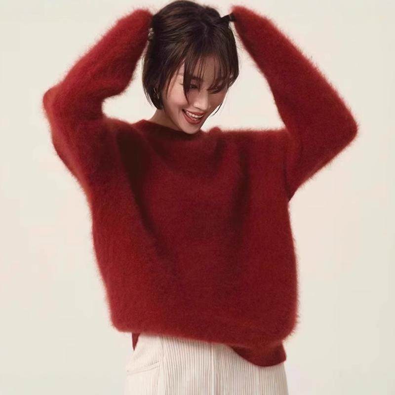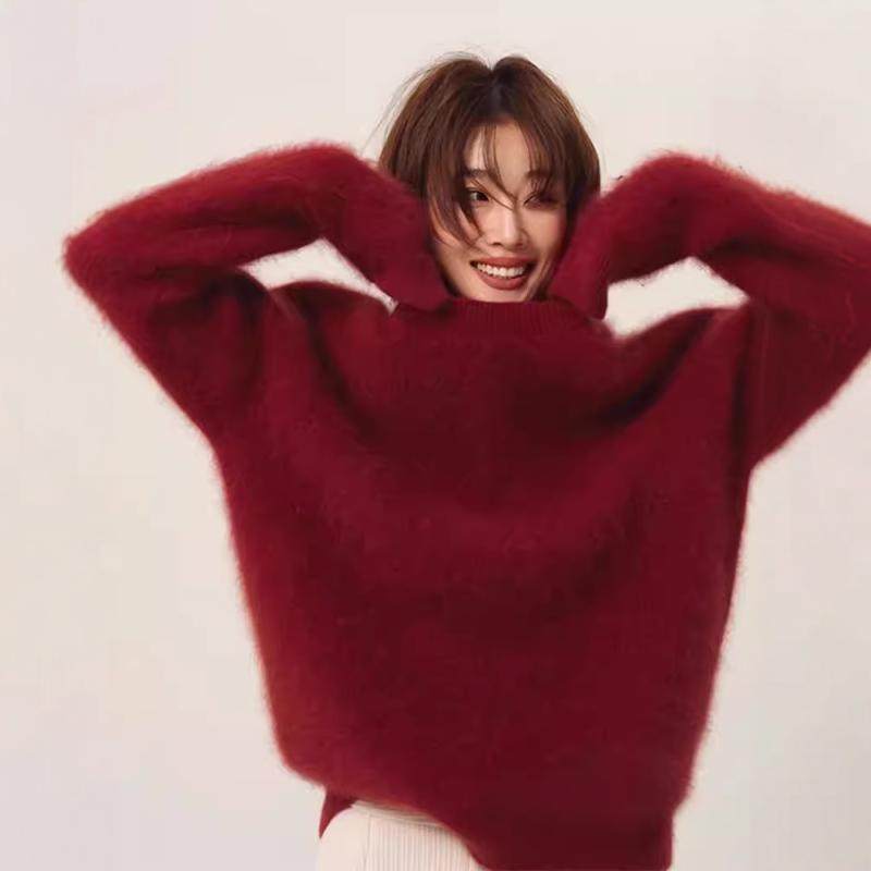 山羊绒拉绒保暖V领圆领针织打底衫 绵羊毛 粉色毛衣 无缝一体