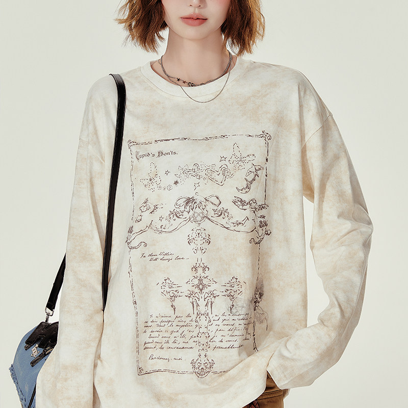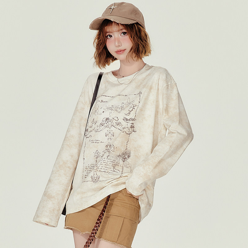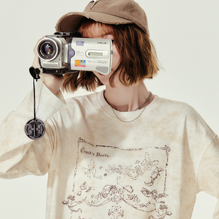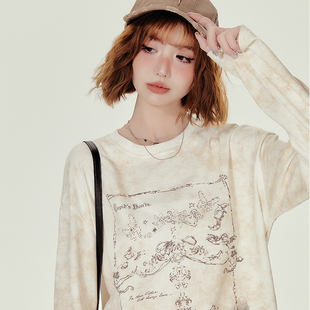 宽松水洗做旧晕染印花上衣 t恤女秋季 Girlyhalo美式 复古圆领长袖