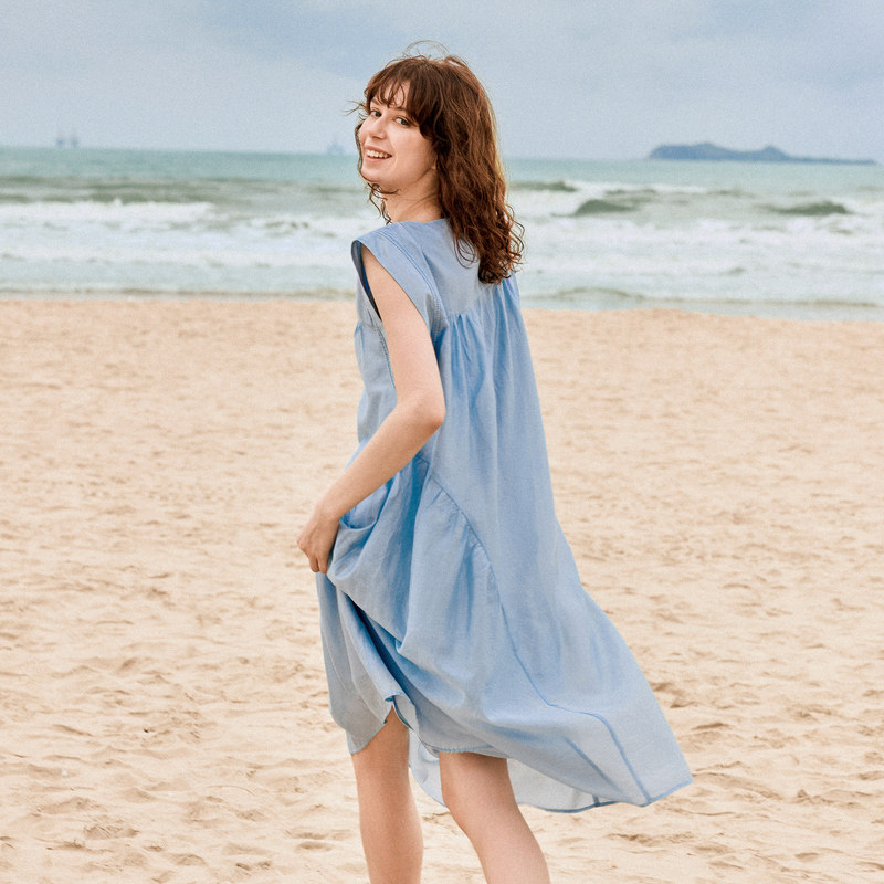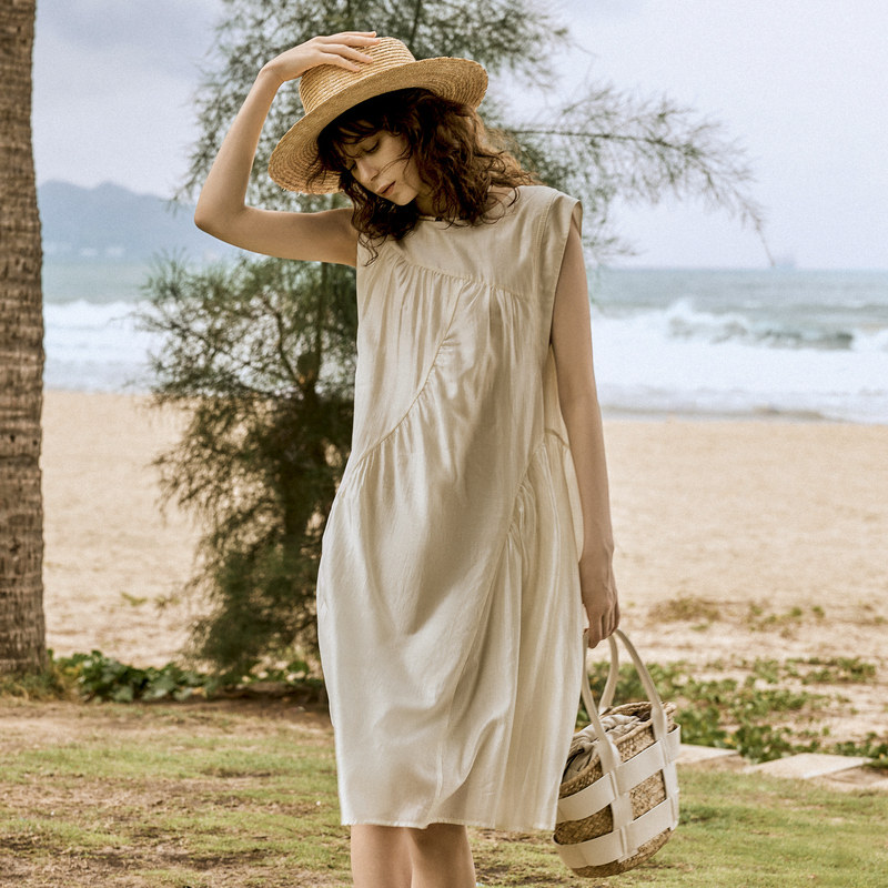 气质米白色无袖 新款 ELLE莱赛尔天丝连衣裙女2025夏季 裙子 自营