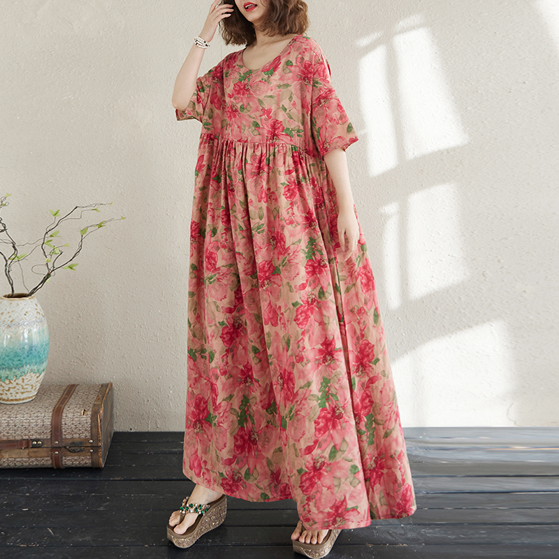 高腰过膝外贸圆领红色印花超仙大摆夏季 薄棉麻简约波西米亚长裙