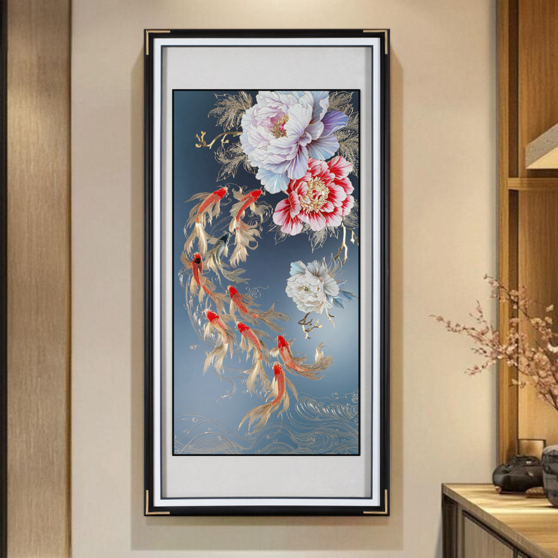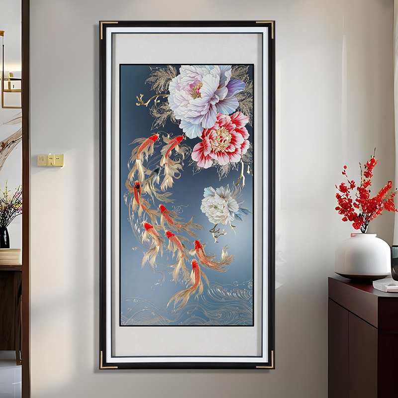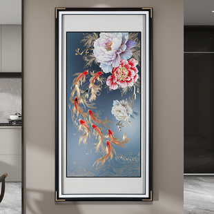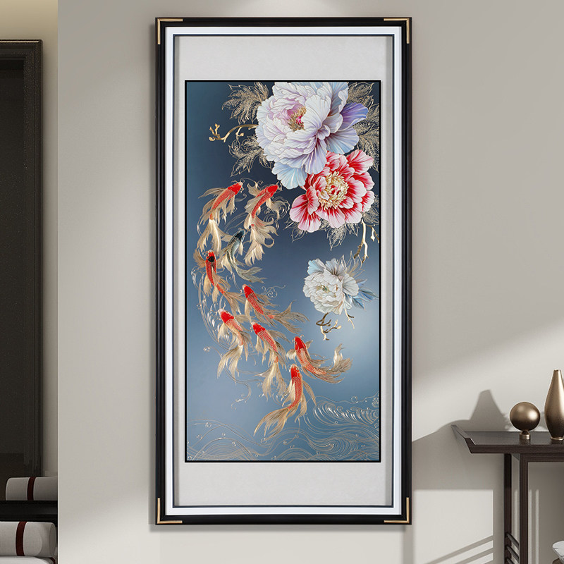 饰画走廊玄关牡丹九鱼图寓意好新中式 富贵绵延2025新款 手工铜雕装
