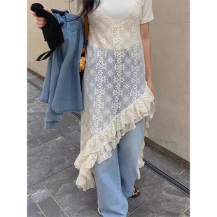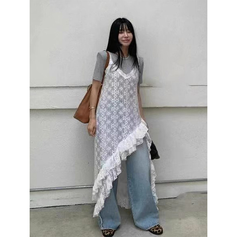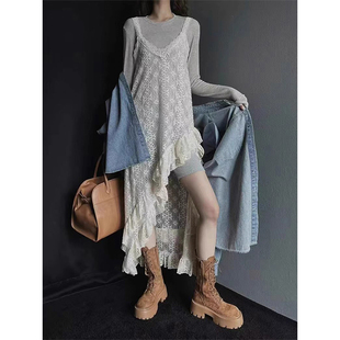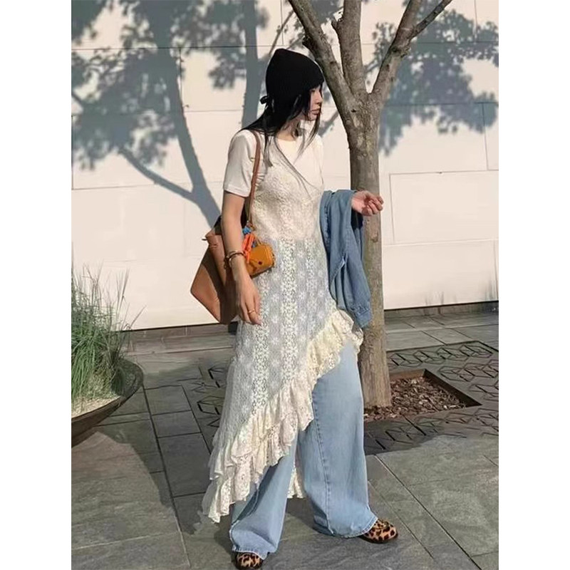 良良家不规则木耳边蕾丝吊带连衣裙女春季 气质微透叠穿长裙子 新款