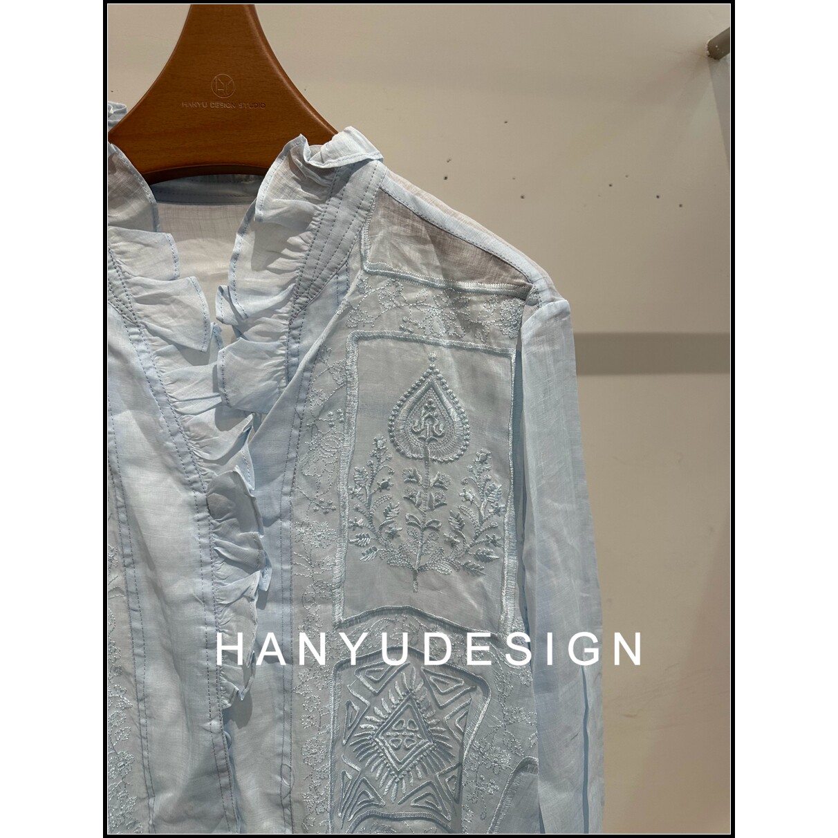 100%苎麻蓝色小清新立领衬衫 26早春新款 女 韩钰DESIGN