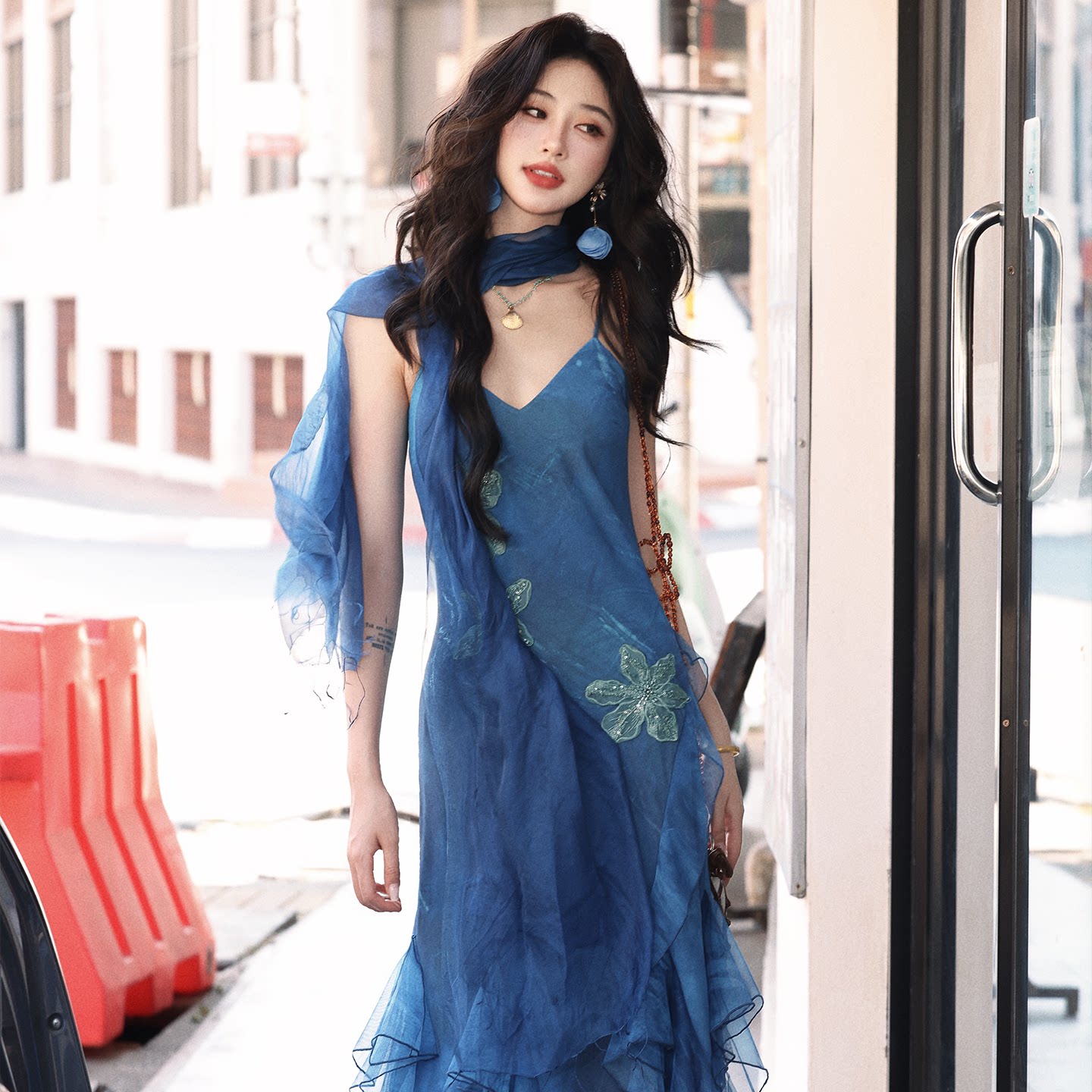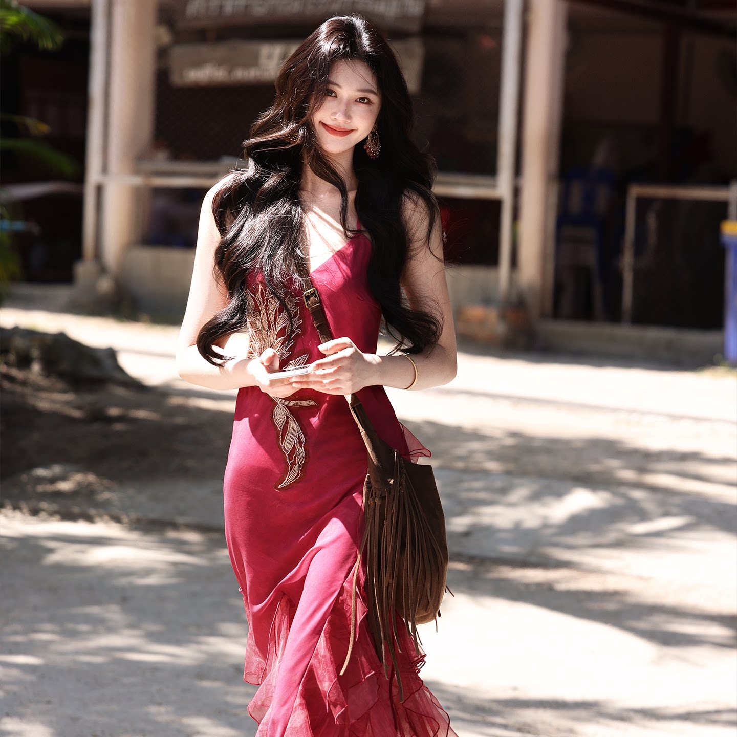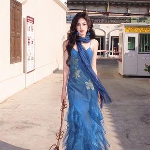 AZure轻法式 鱼尾吊带长裙气质显白显瘦收腰连衣裙钉珠拖地裙 修身
