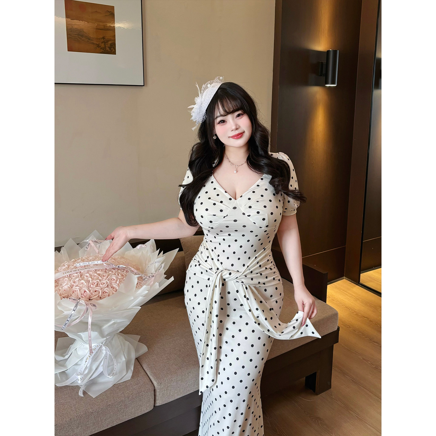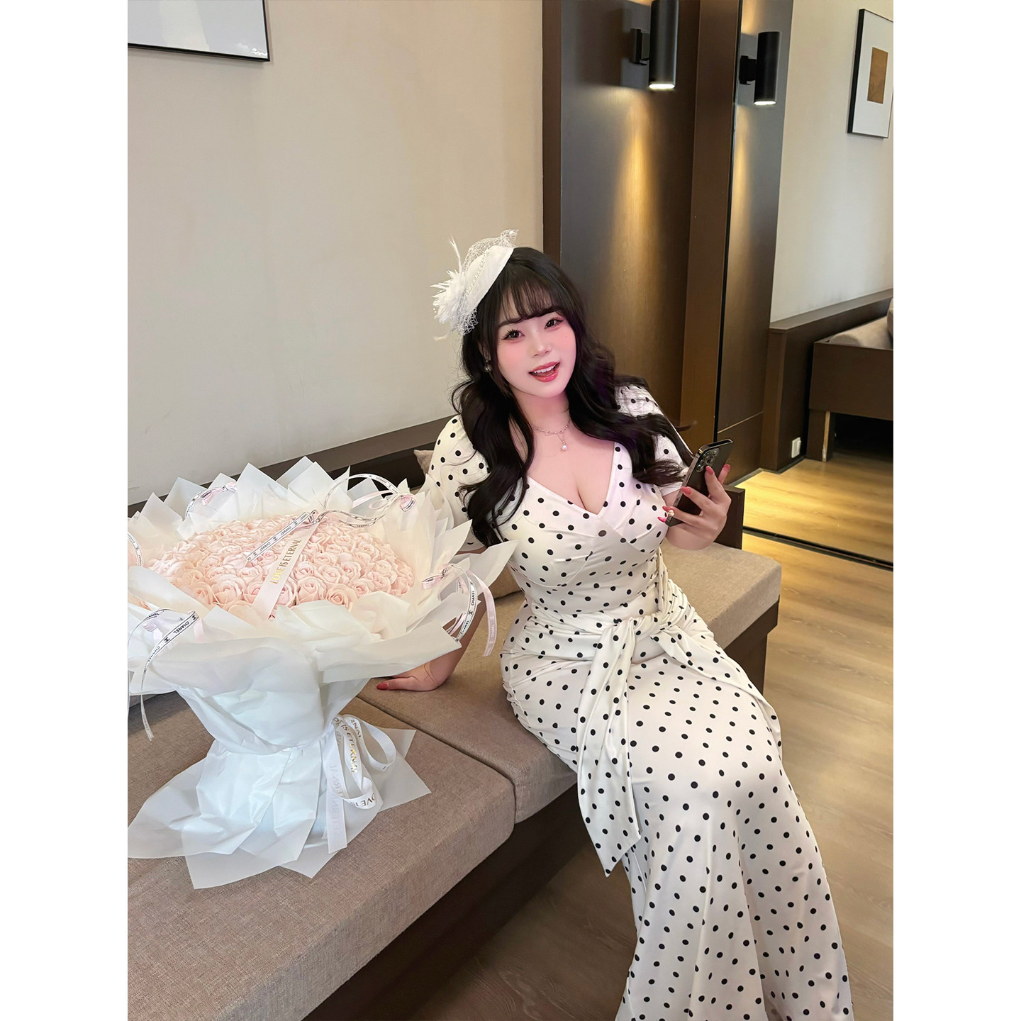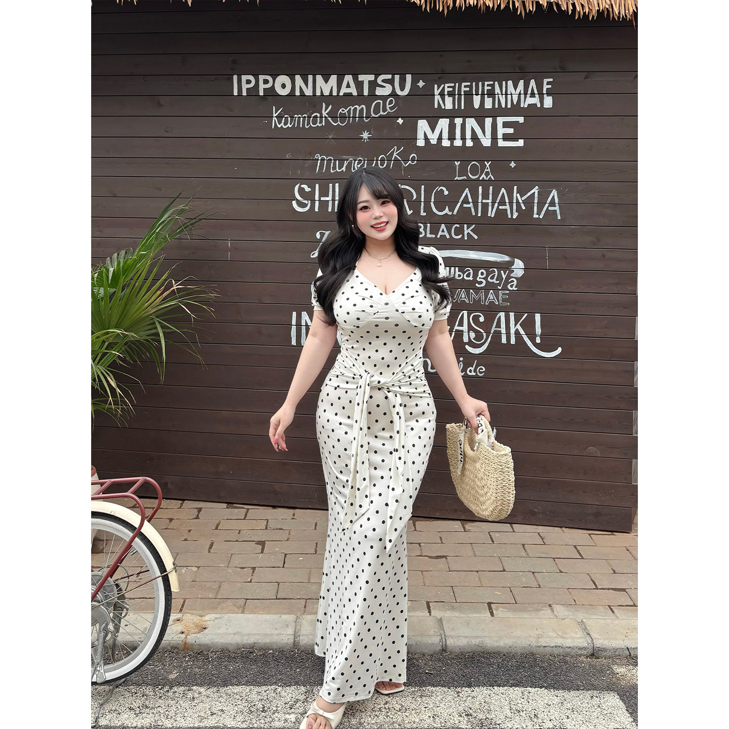 babes 时尚 人间白茶 夏季 显瘦复古波点连衣裙女休闲长裙 大码