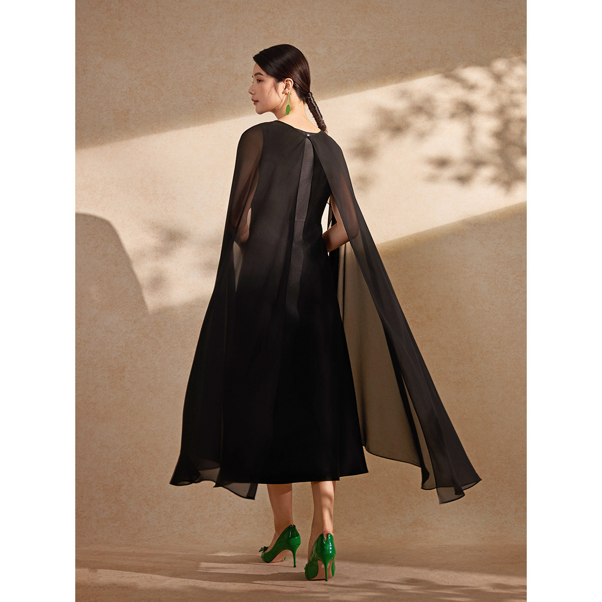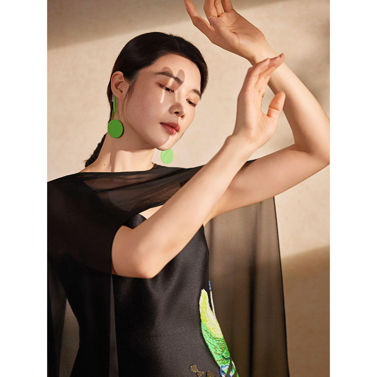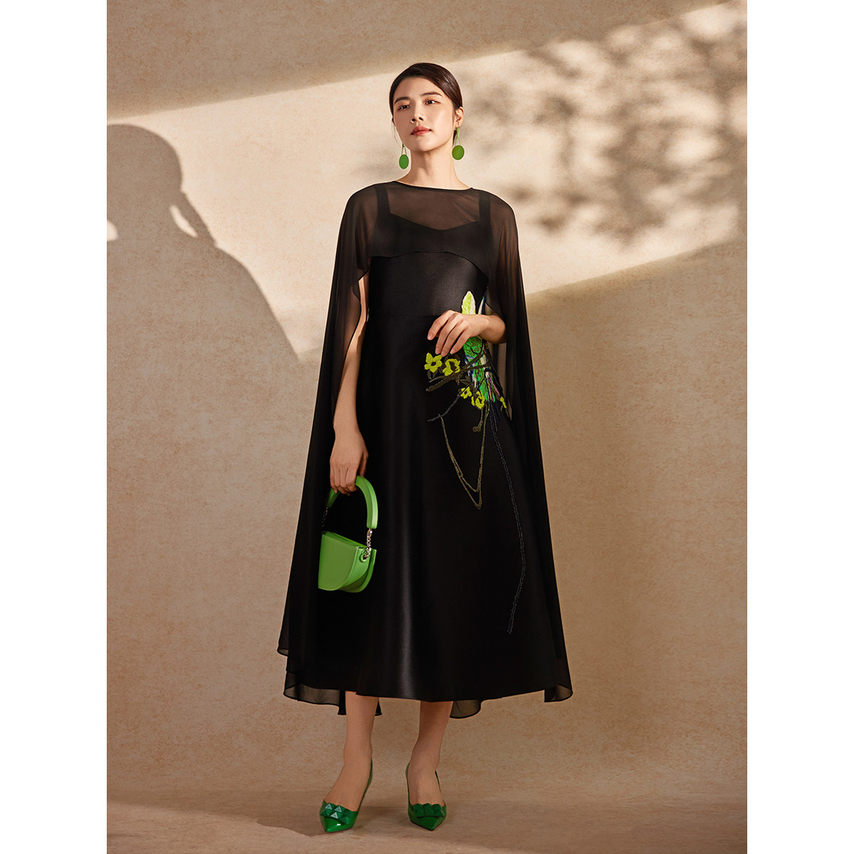 粉蓝衣橱2026夏新款 裙艺术感薄纱披肩小黑裙 芙蓉重工立体刺绣套装