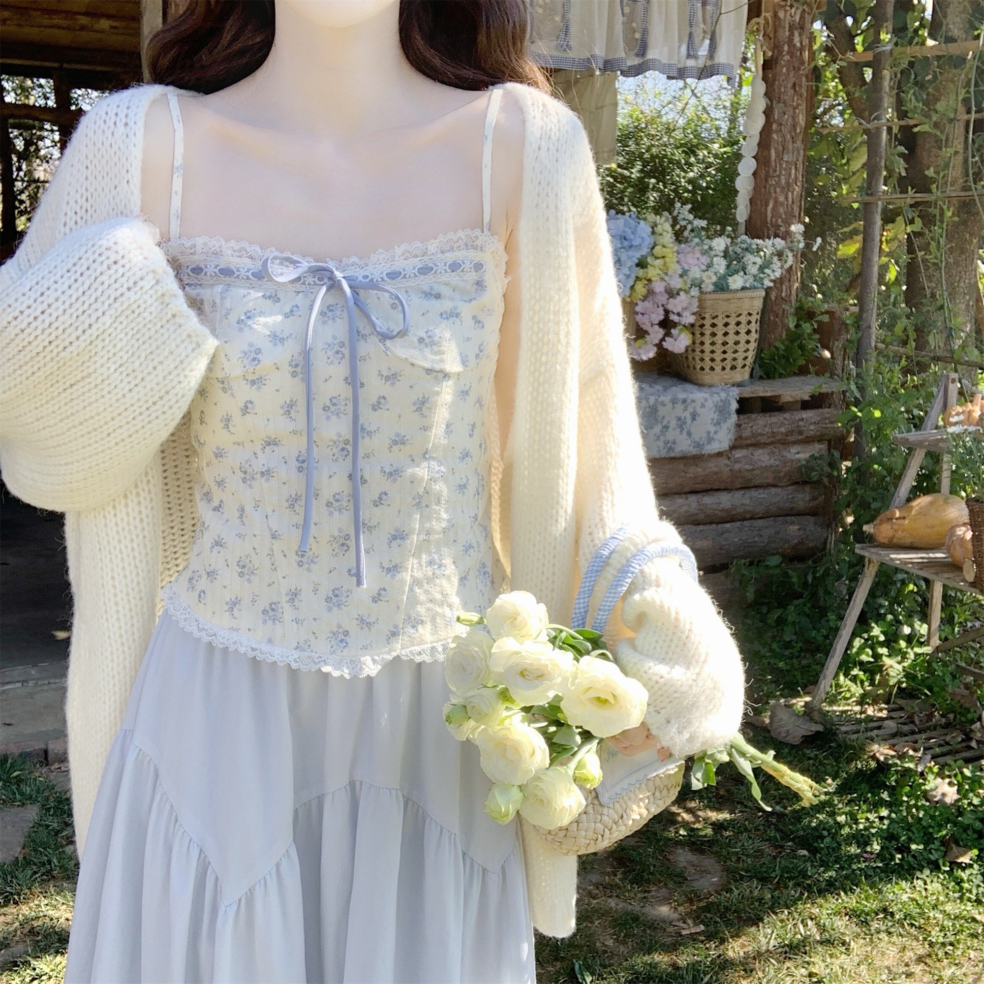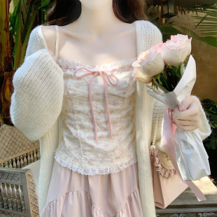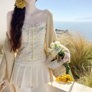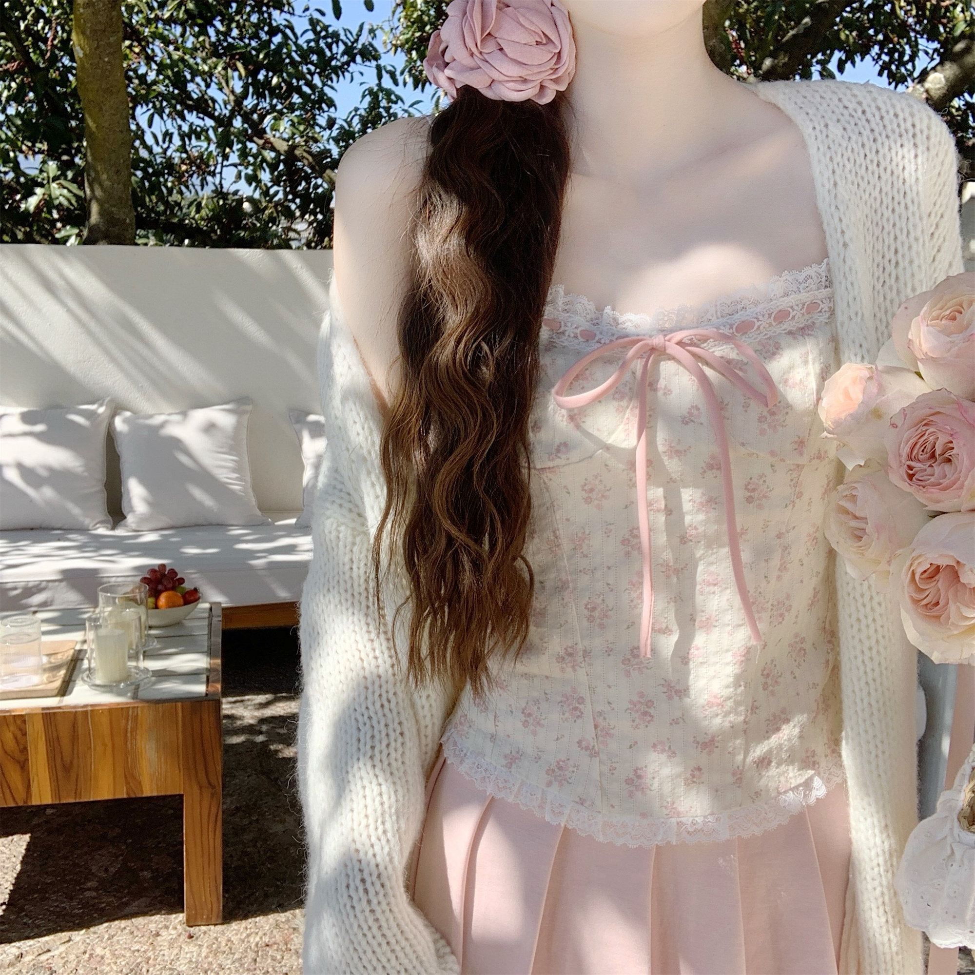 多色碎花蕾丝方领系带吊带背心甜美无袖 春日新款 上衣 Dear