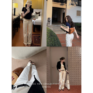 女纯棉百搭直筒休闲长裤 三喜threec 白色中低腰立体口袋牛仔裤