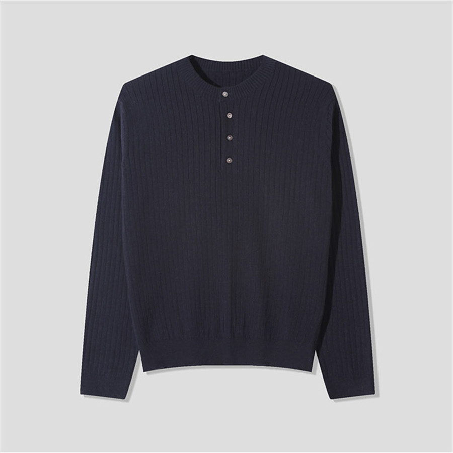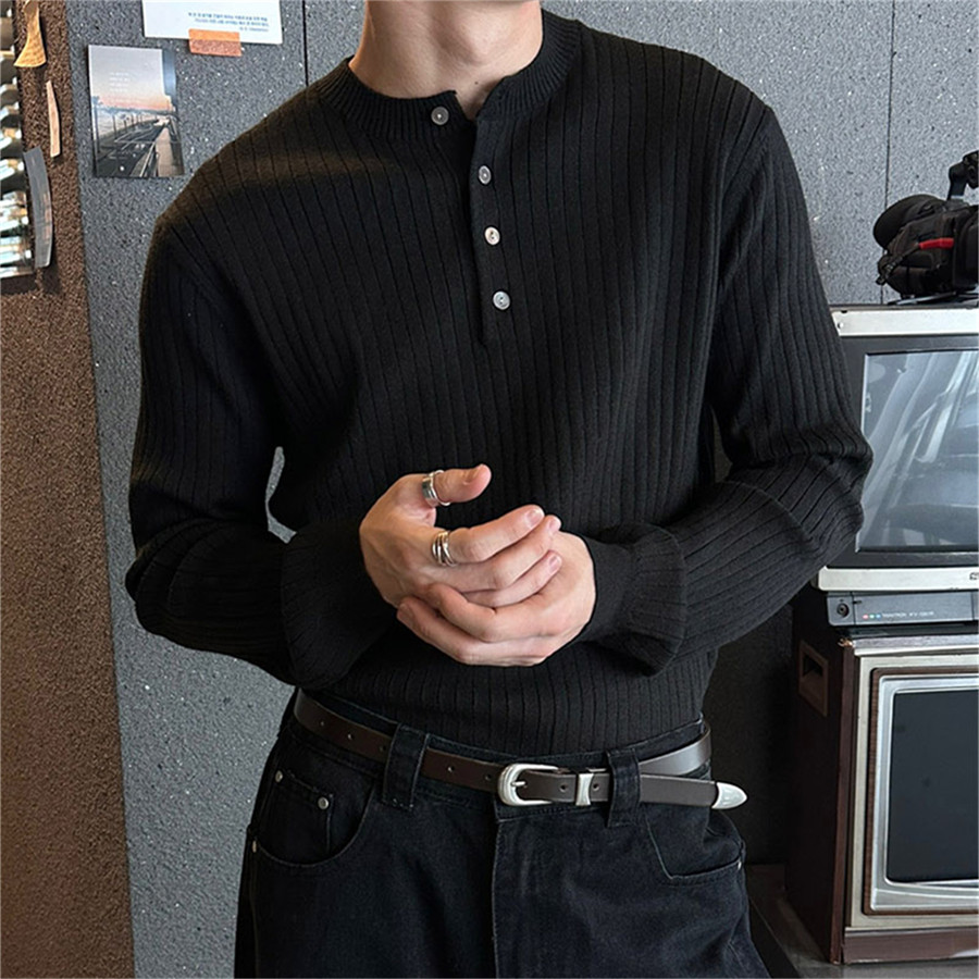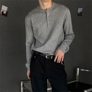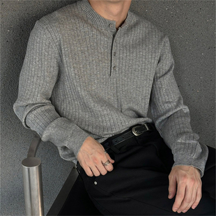 MRDONG韩国男装 气质亨利领竖条纹理休闲针织打底毛衣亲肤T恤 代购