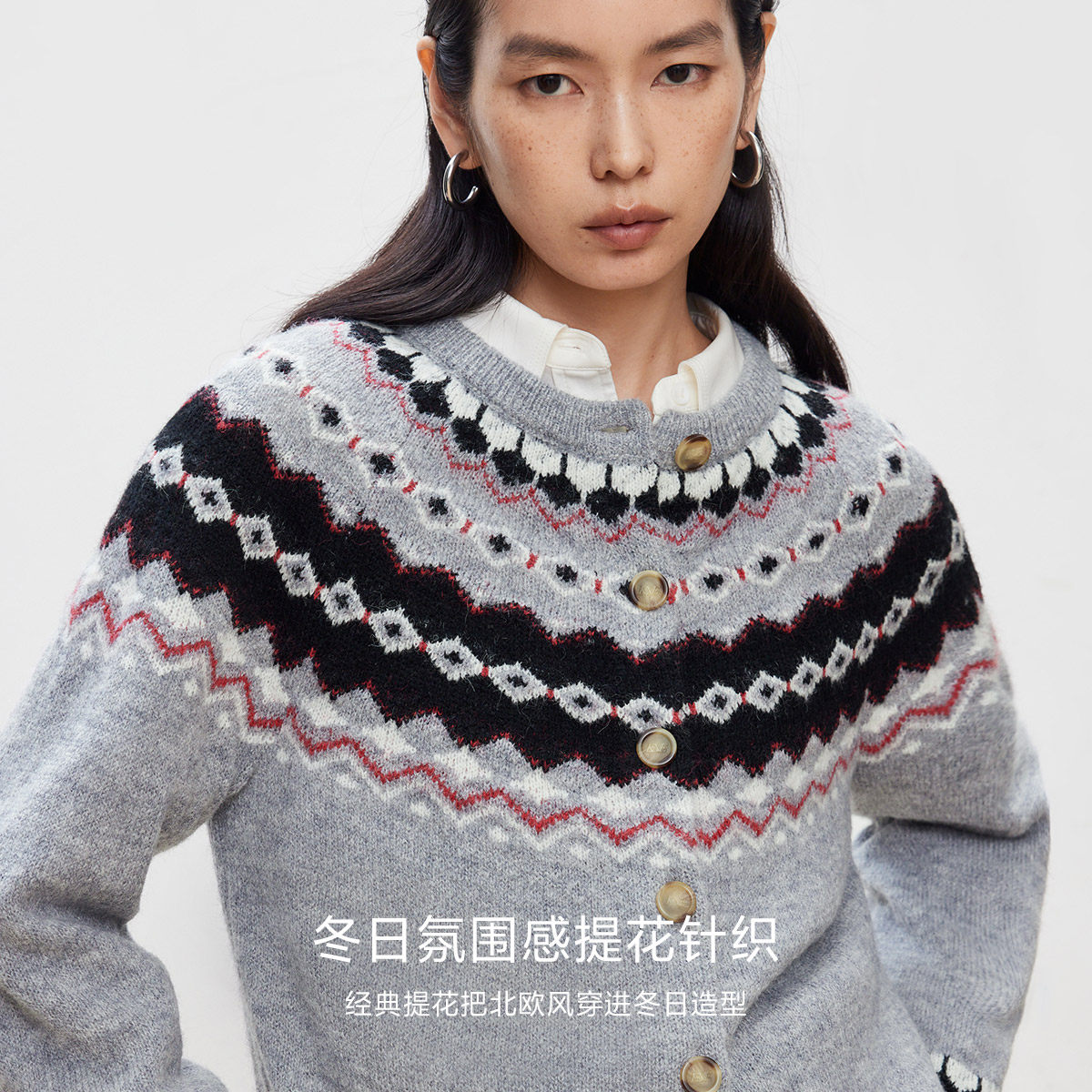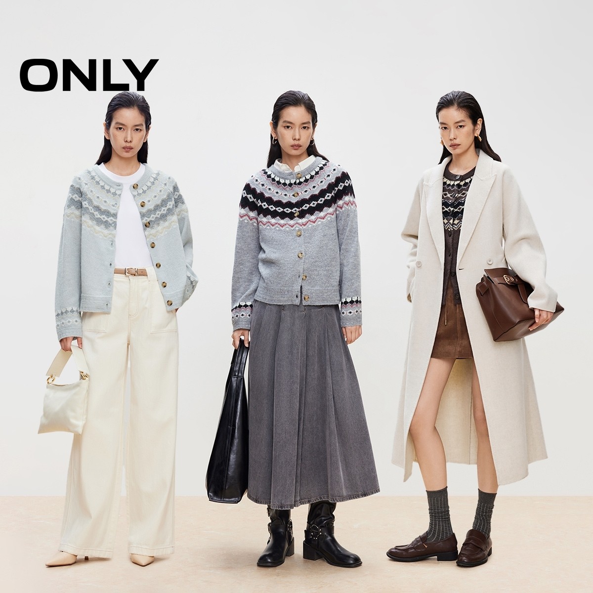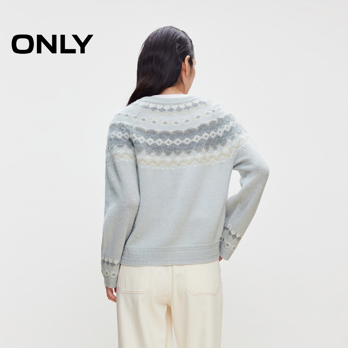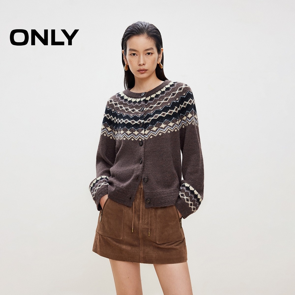 针织衫 开衫 女 北欧风圆领时髦提花含绵羊毛长袖 ONLY2025秋冬新款