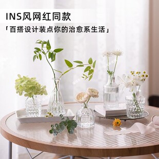 迷你小花瓶玻璃透明法式 浮雕桌面插花复古轻奢鲜花车载高级感摆件