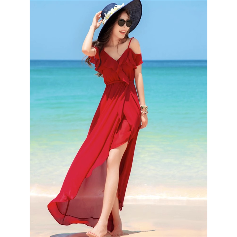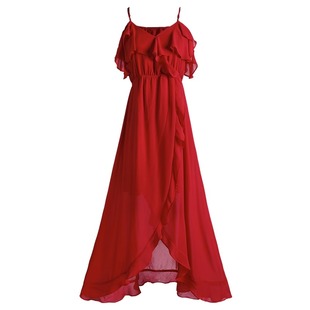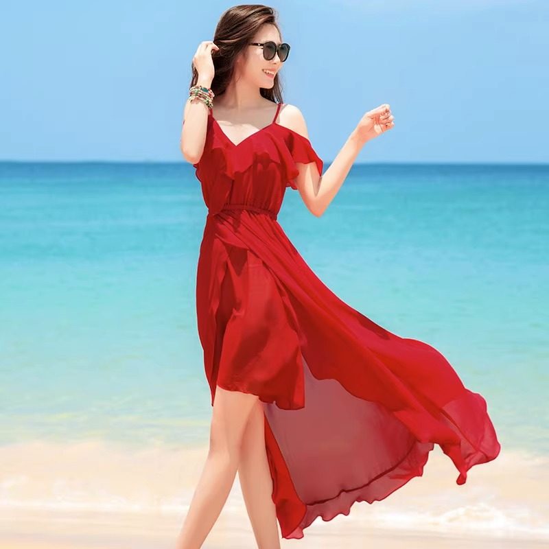 海边度假连衣裙女夏季 高端红色波西米亚旅游三亚小个子沙滩吊带裙