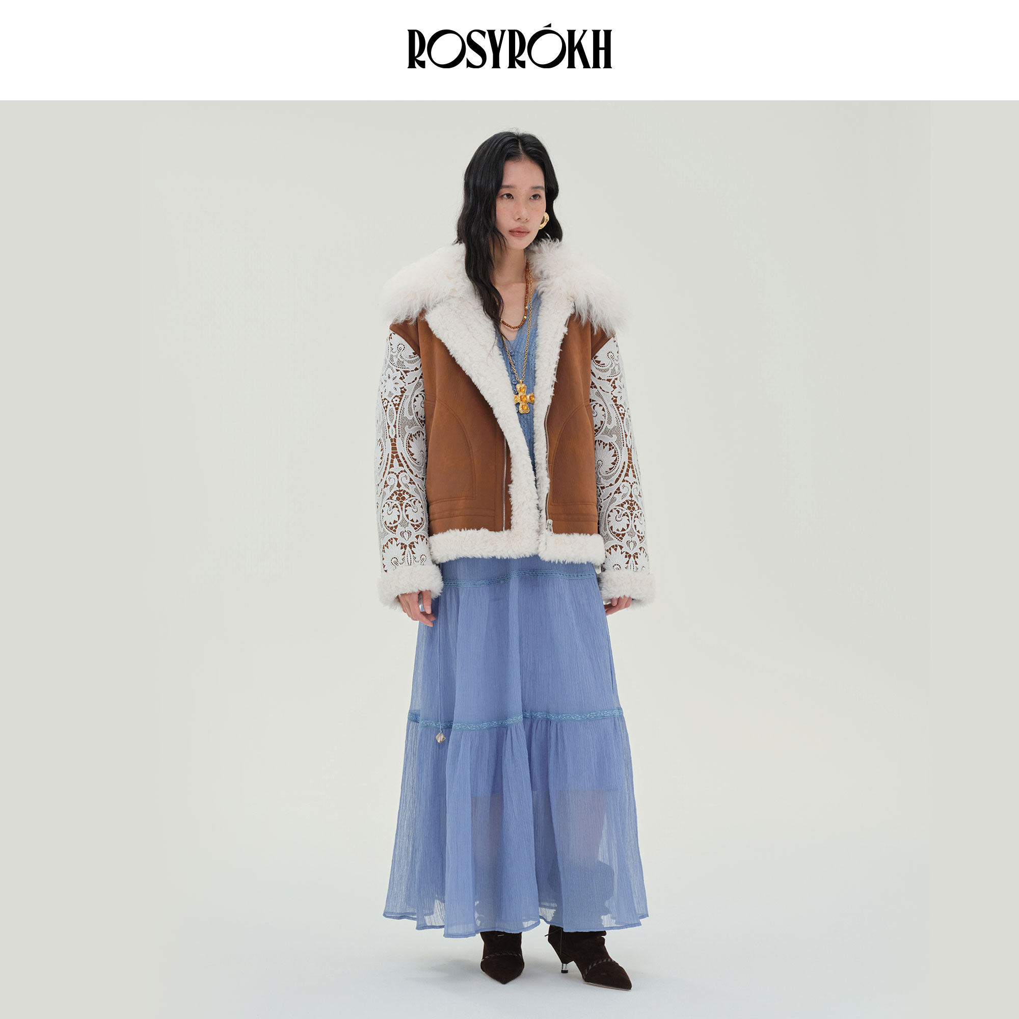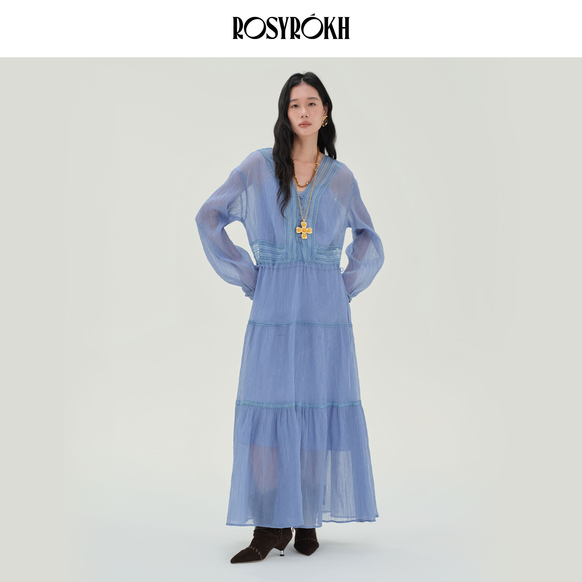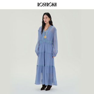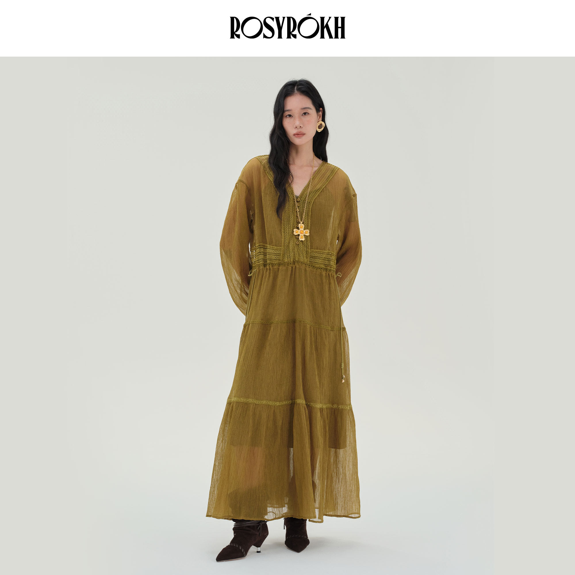 ROSYROKH原创设计2025AW复古长裙V领纽扣两件套长袖 收腰连衣裙女