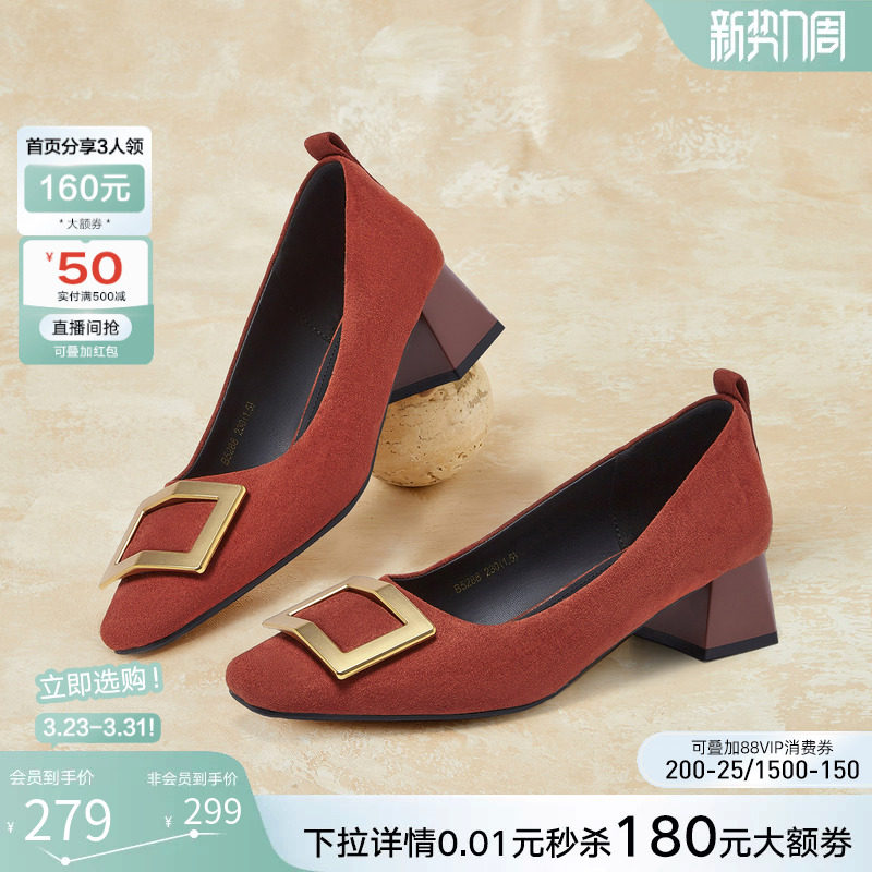 高跟鞋 百思图2026春新款 红色婚鞋 气质方扣粗跟女单鞋 B5288AQ6 法式
