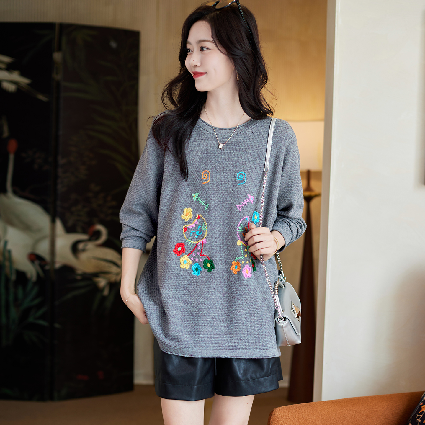 慵懒打底上衣 洋气减龄大码 宝诗黎圆领刺绣宽松针织衫 女2025秋季