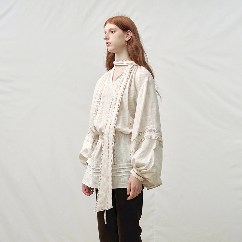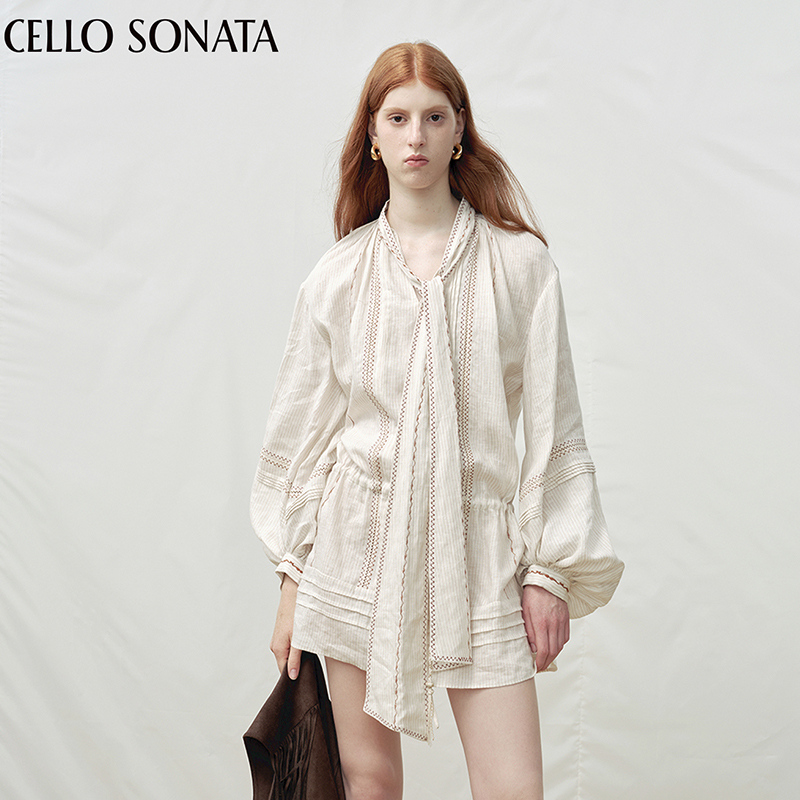 Cello 重工特种刺绣亚麻条纹连衣裙CHENSHOP设计师 Sonata早秋新款