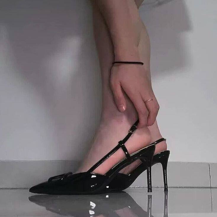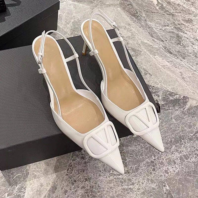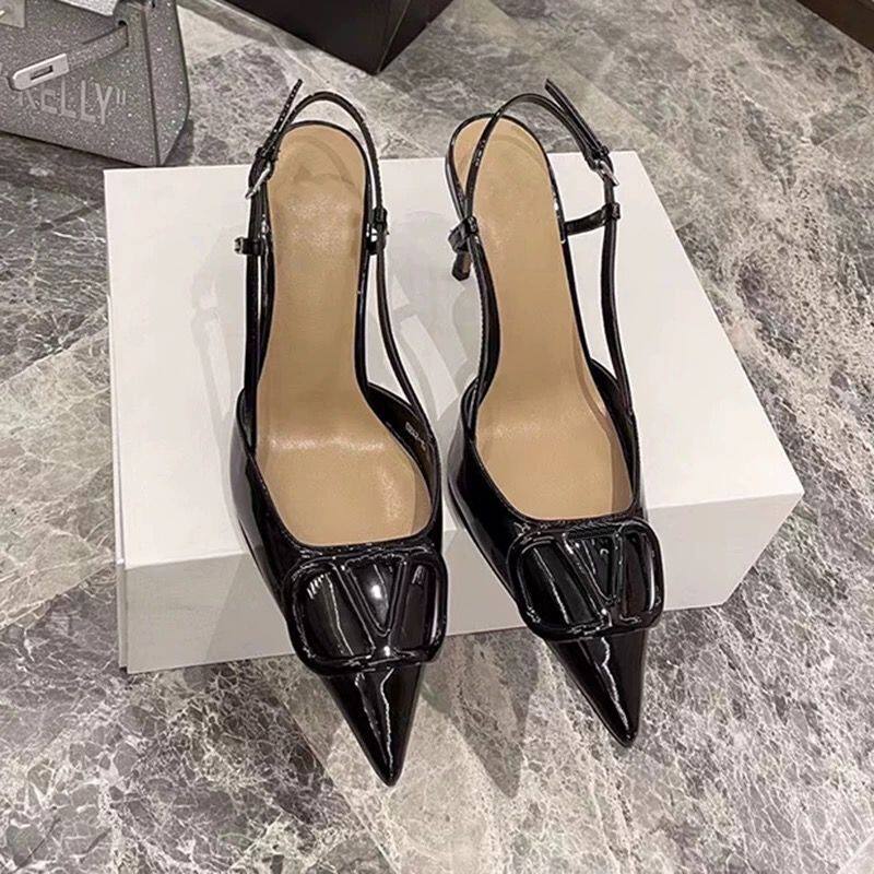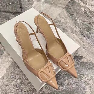 尖头V扣一字后空包头凉鞋 裸色高跟鞋 细跟单鞋 法式 女2025春秋新款