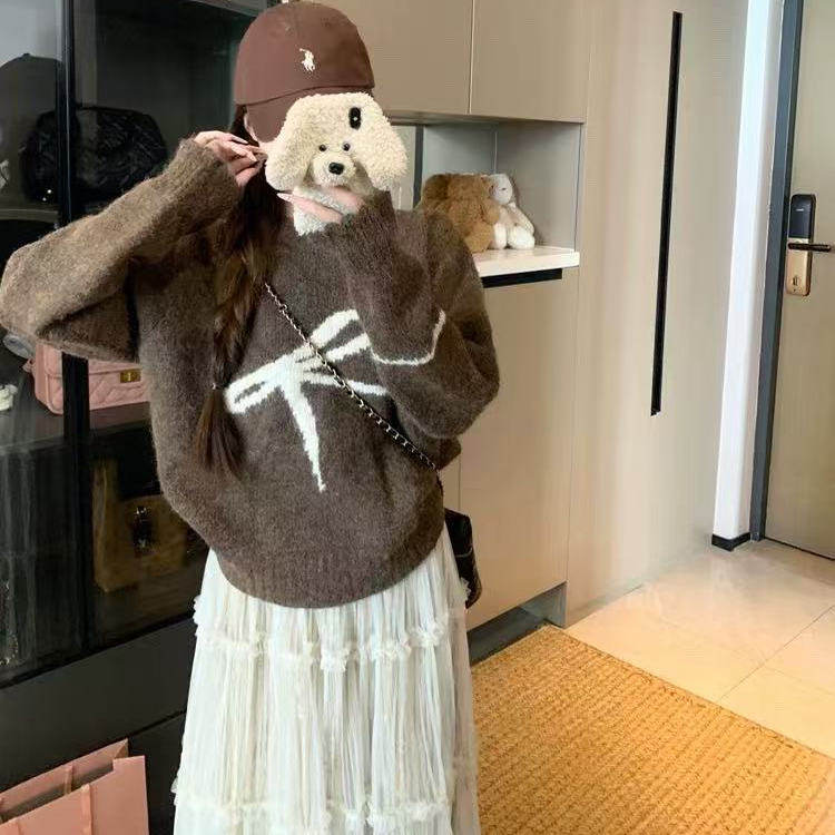 A235蝴蝶结提花针织毛衣女宽松显瘦百搭上衣 小四粉丝专享