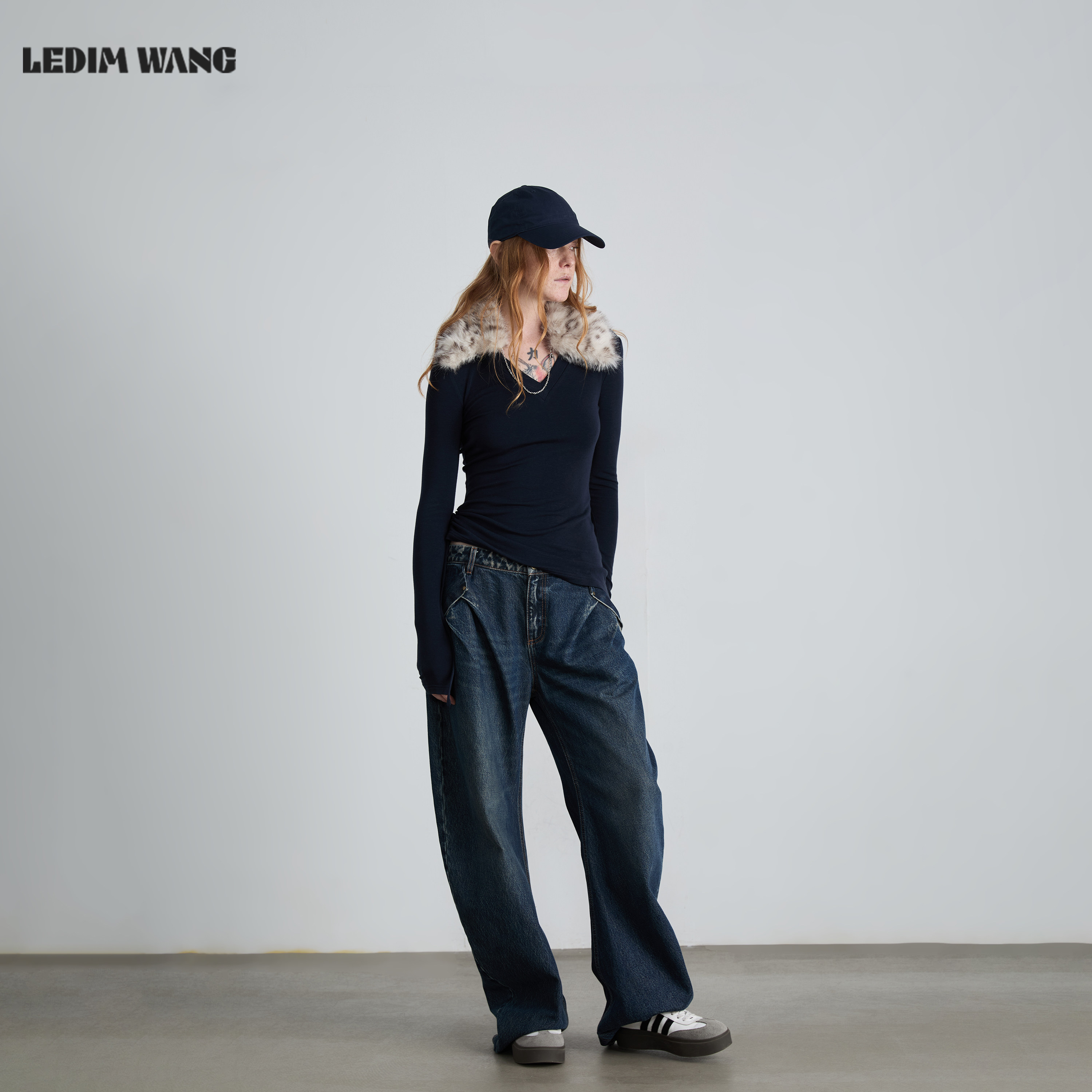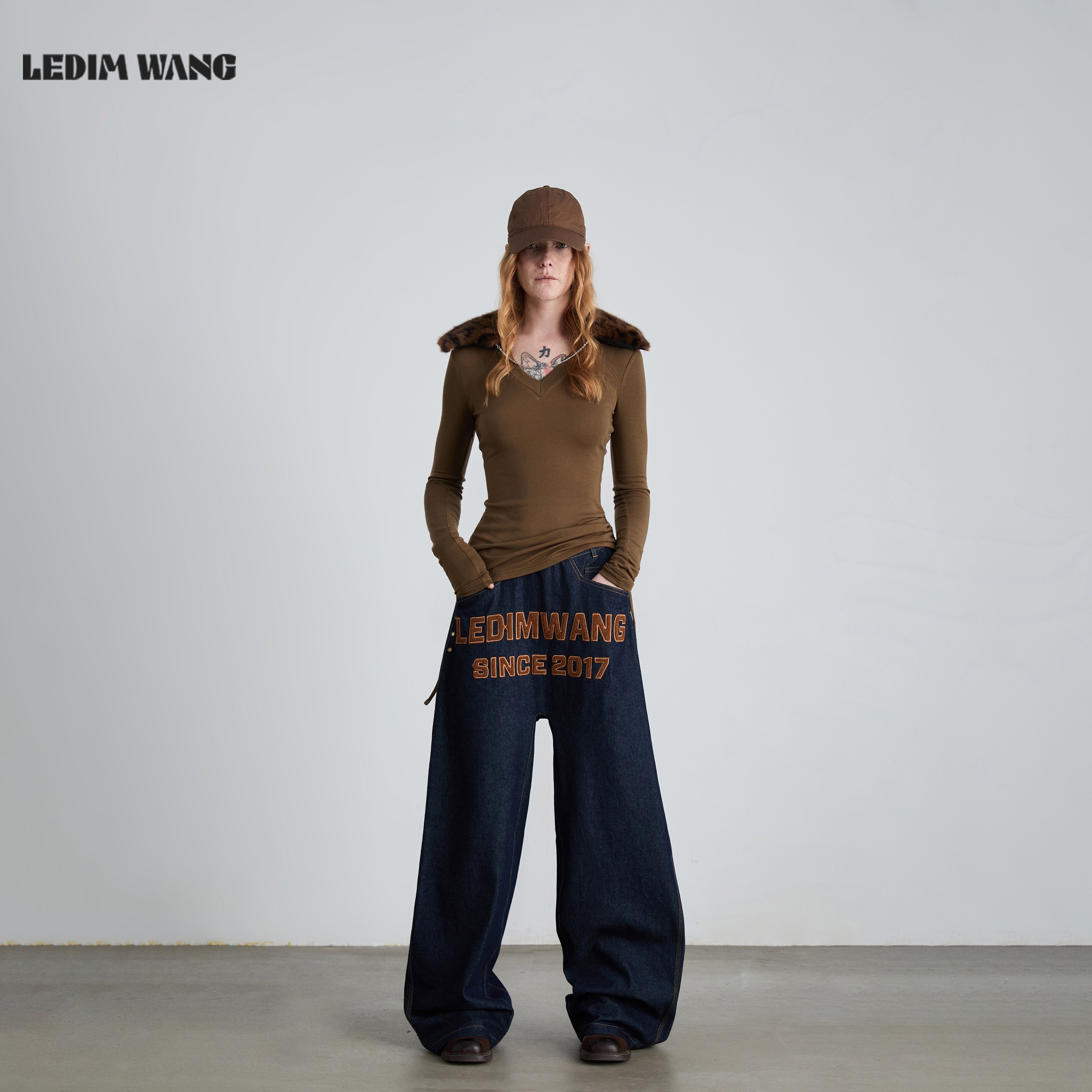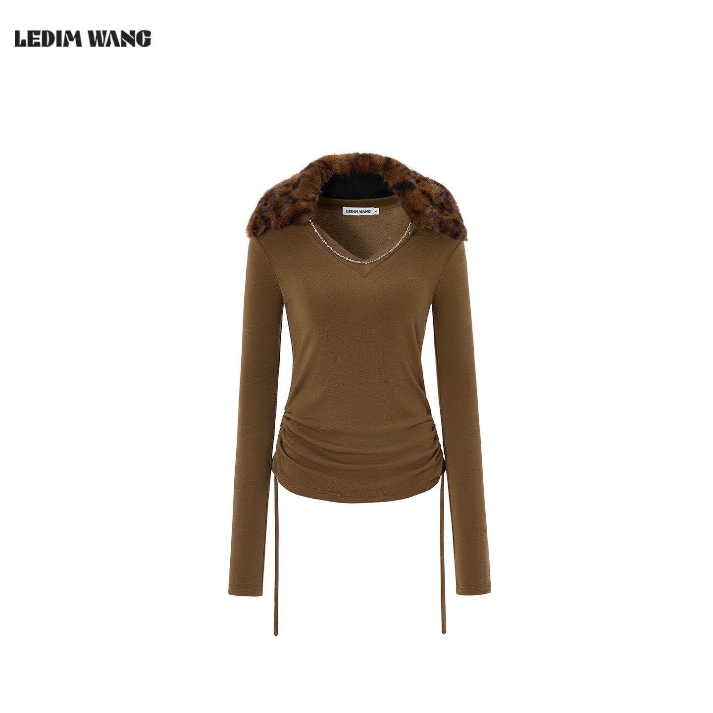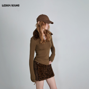 上衣 军绿色内搭长袖 LEDIM WANG动物纹可拆毛领V领T恤女25秋冬新款